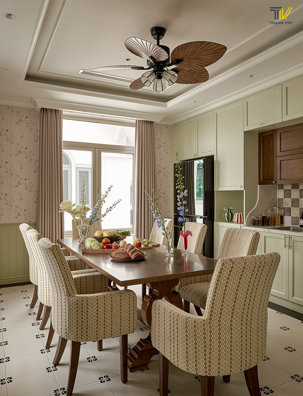Không gian bếp được thiết kế và thi công trọn vẹn bởi Thanh Viet Interior, đáp ứng đầy đủ công năng của một căn bếp hiện đại: từ khu vực nấu nướng, hệ tủ bếp tiện nghi đến các thiết bị gia dụng cao cấp.