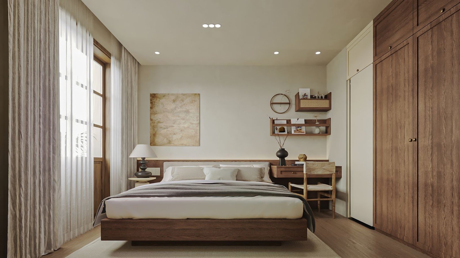 Hai phòng ngủ trên tầng được thiết kế theo nhu cầu của từng người. Cả hai đều hướng đến sự tối giản nhưng tiện nghi. Đồ nội thất sử dụng gỗ sồi, kết hợp cùng ánh sáng tự nhiên để giữ cảm giác thư giãn.