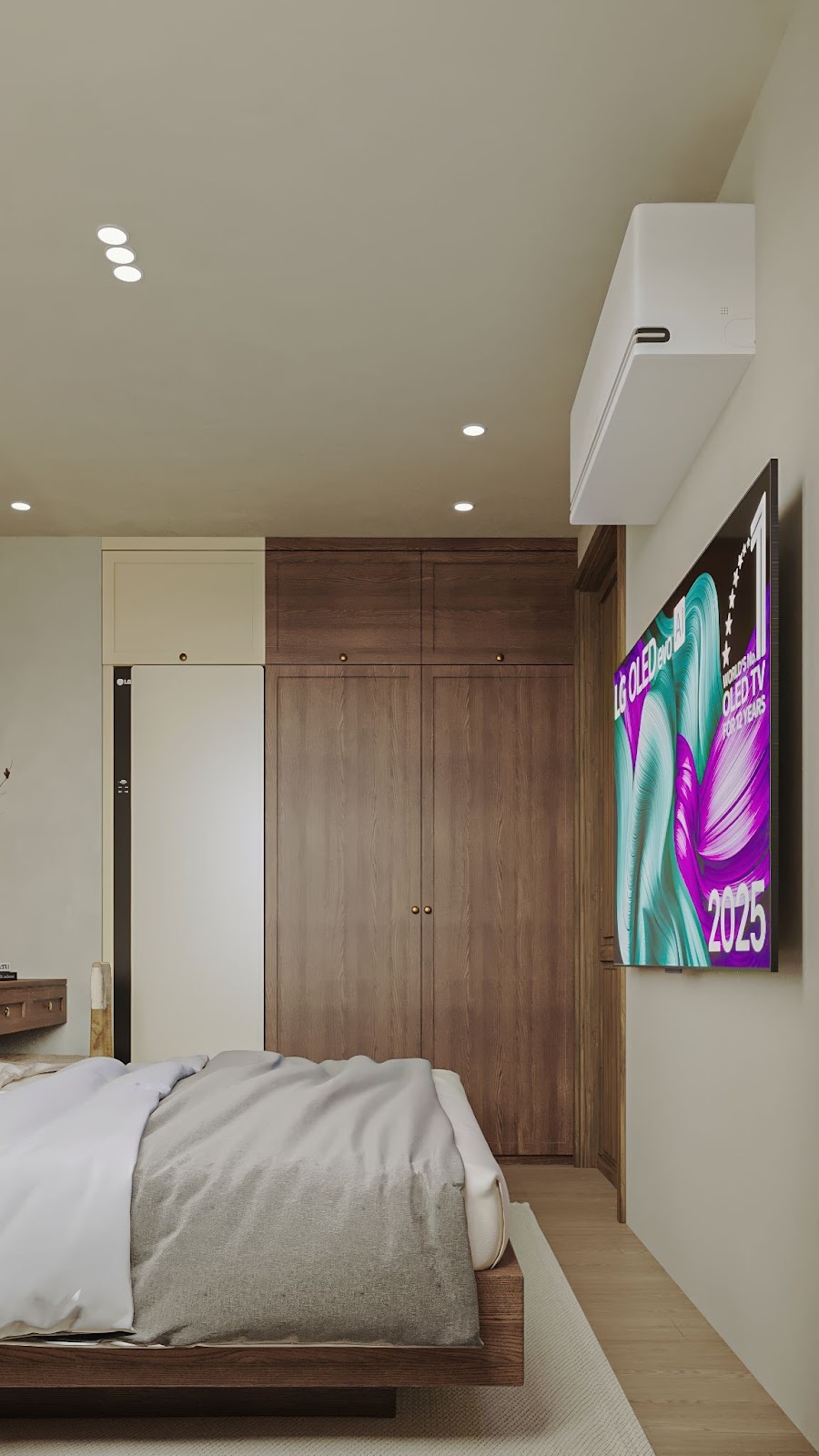 TV LG OLED được treo đối diện giường ngủ, kết hợp cùng điều hoà DUALCOOL™ Inverter – công nghệ hiện đại trong căn phòng mộc mạc