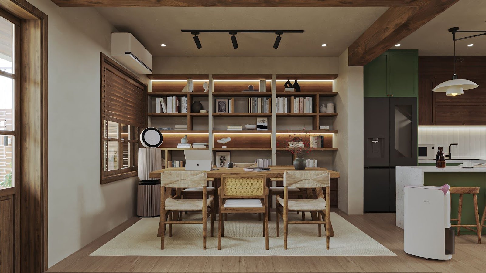 Bức tường sách lớn chạy dọc phòng ăn là điểm nhấn đầy cá tính. Bên cạnh đó, máy lọc không khí LG PuriCare 360° Dual Booster được bố trí cạnh cửa sổ giúp giữ không gian luôn trong lành – rất cần thiết với ngôi nhà nuôi nhiều chó.