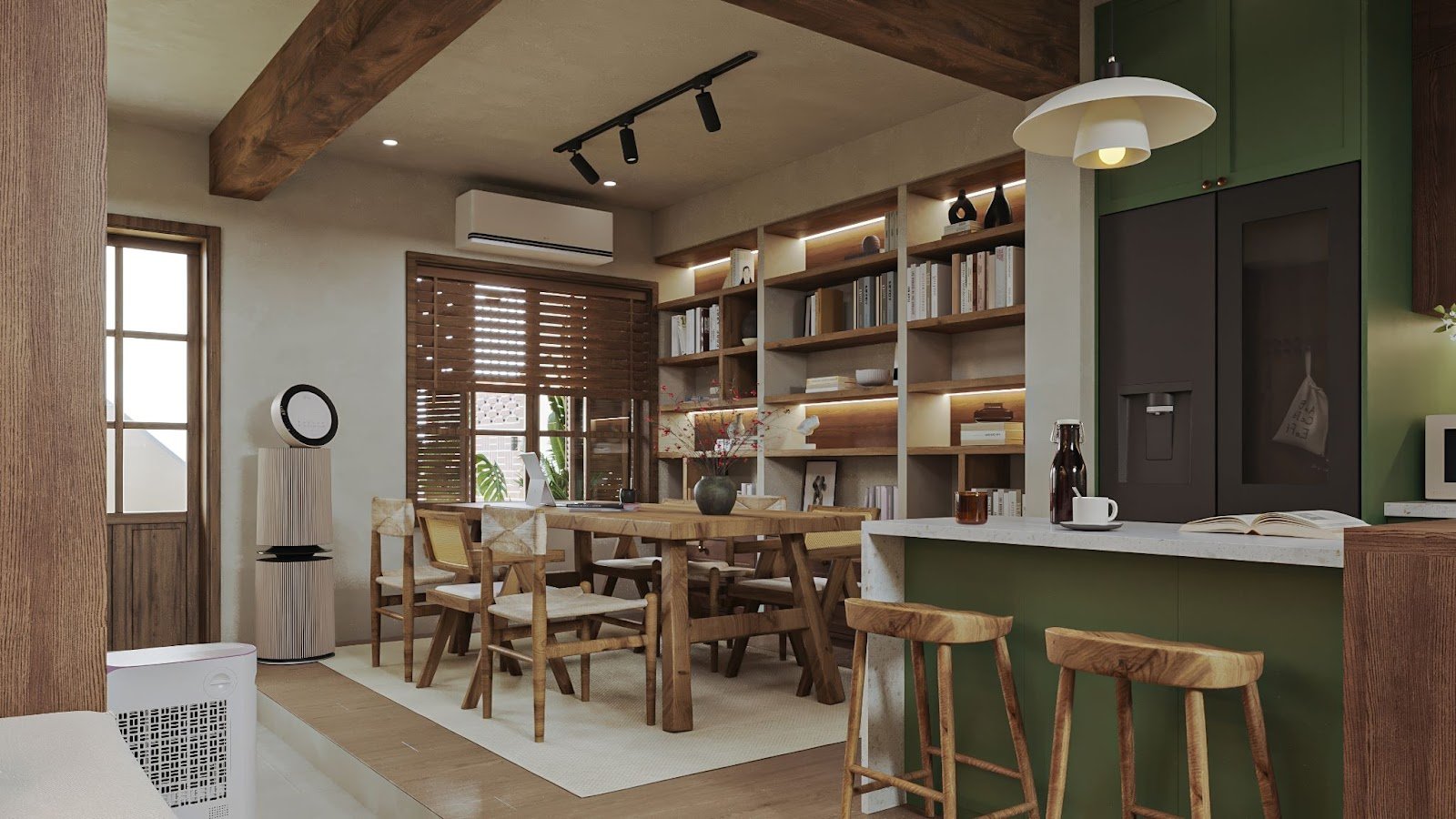 Ngay từ khi bước vào, cảm giác gần gũi bao trùm nhờ vào chất liệu gỗ, màu sơn ấm và ánh sáng dịu nhẹ. Không gian sinh hoạt chung không có phòng khách mà được thiết kế thành bếp kết hợp bàn ăn – cũng là khu làm việc và đọc sách.