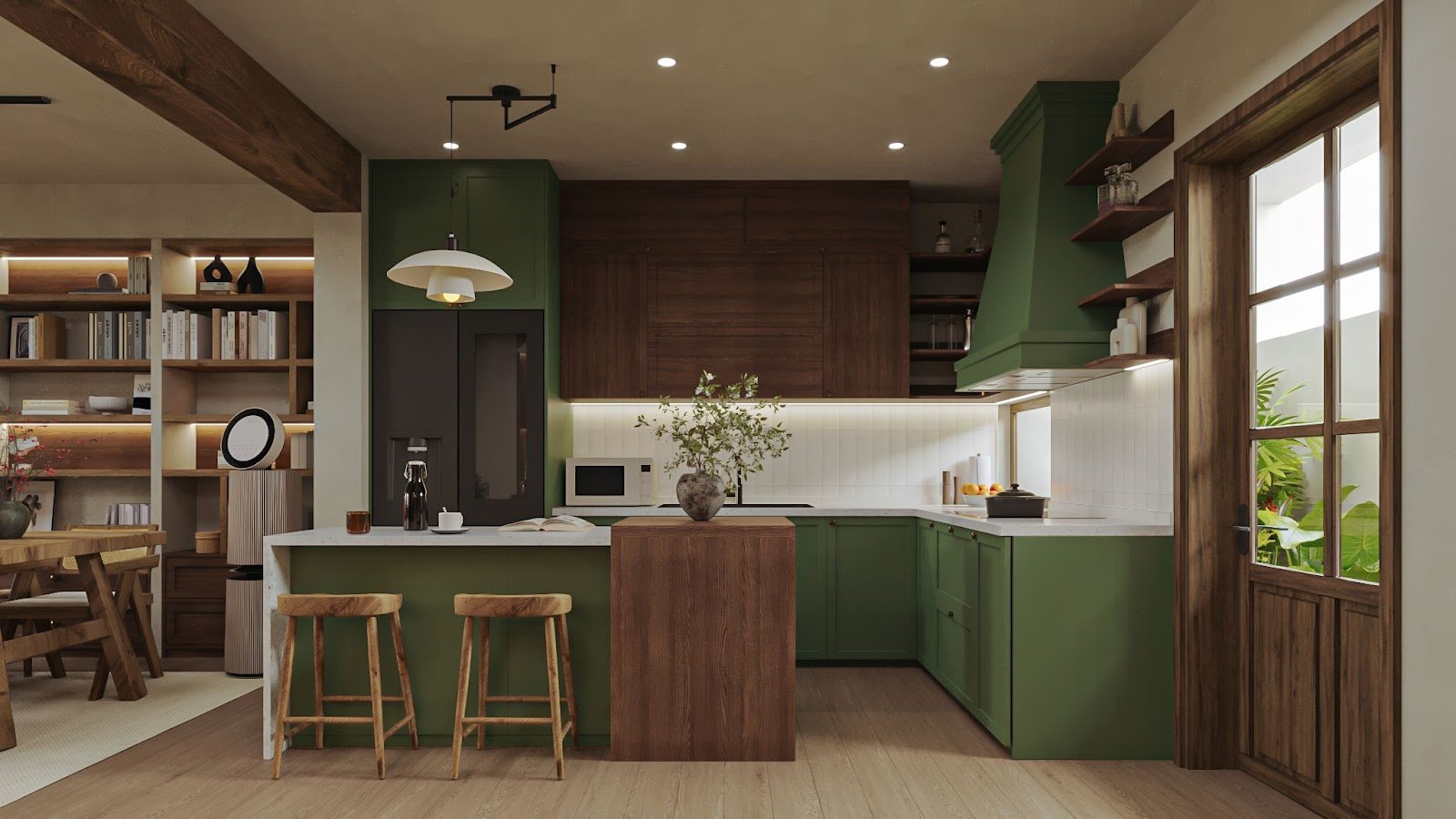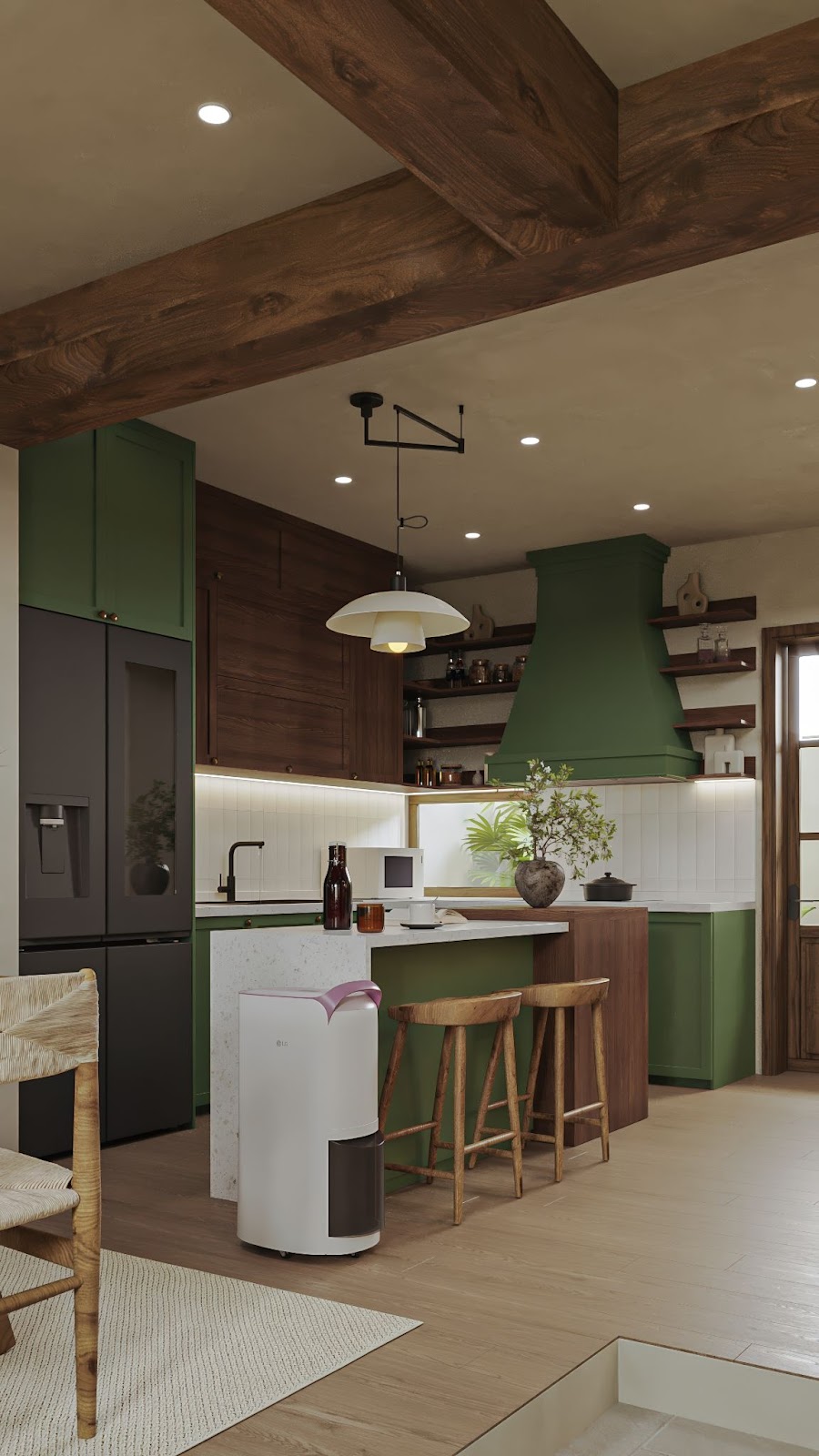 Phía bếp, Tủ lạnh LG French Door InstaView™ âm tường kết hợp màu đen nhám tinh tế, hiện đại sang trọng với hệ tủ màu xanh lá và gỗ sậm, tôn lên tinh thần farmhouse hiện đại mà mộc mạc.