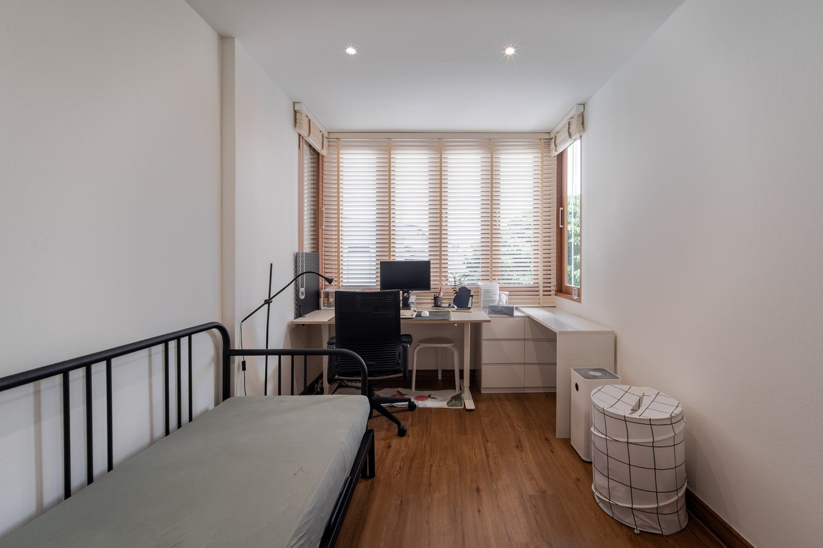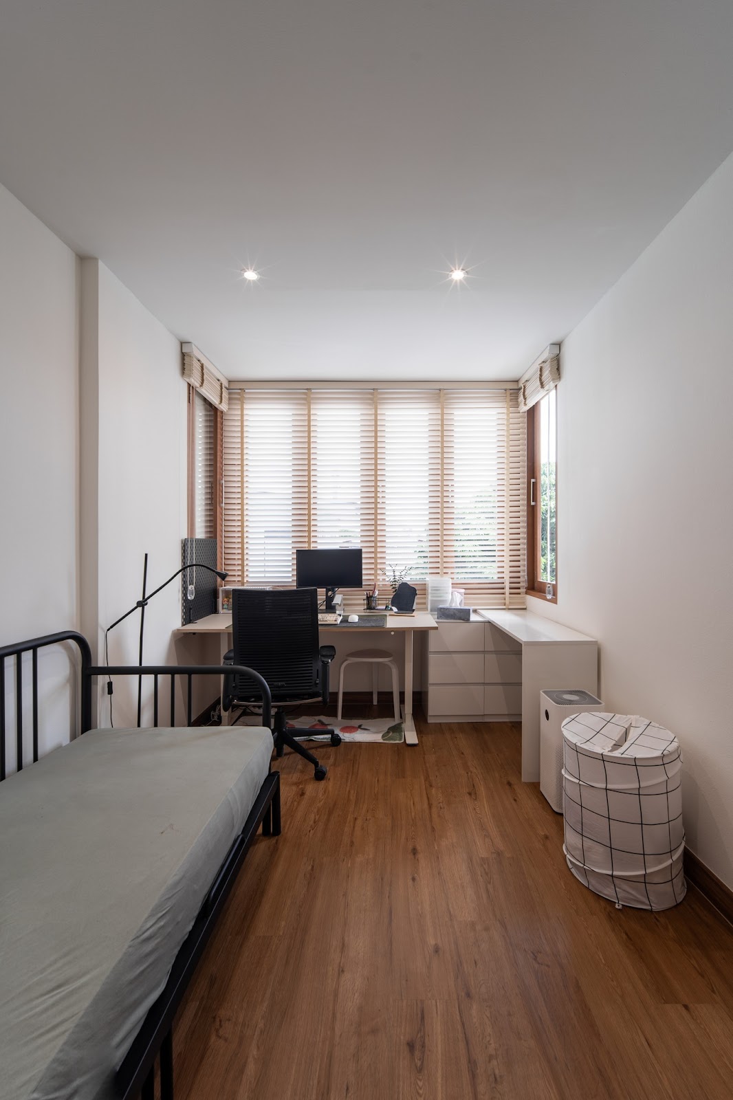 Phòng làm việc kiêm phòng đa năng của S House bố trí bàn vi tính cạnh cửa sổ lớn với rèm gỗ ngang, tận dụng tối đa ánh sáng tự nhiên và tầm nhìn xanh mát