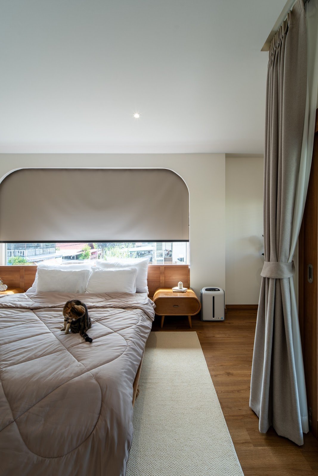 Phòng ngủ tầng với giường bọc vải màu be, chú mèo nằm thư giãn trên chăn và cửa sổ cong mềm mại tạo điểm nhấn duyên dáng