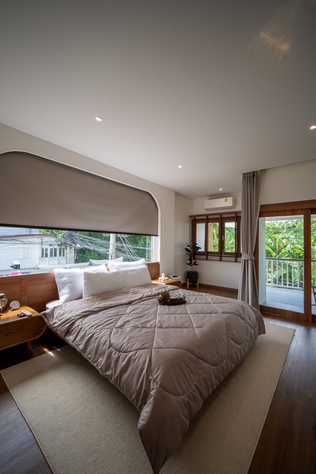 Trái ngược với sự ấm cúng của tầng trệt, phòng ngủ lại hướng đến cảm giác thoáng sáng và tối giản tuyệt đối. Giường đặt cạnh cửa kính lớn nhìn ra ban công xanh mát, rèm vải mềm rủ nhẹ tạo nên bầu không khí thư thái.