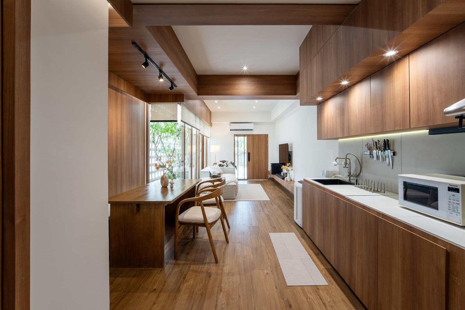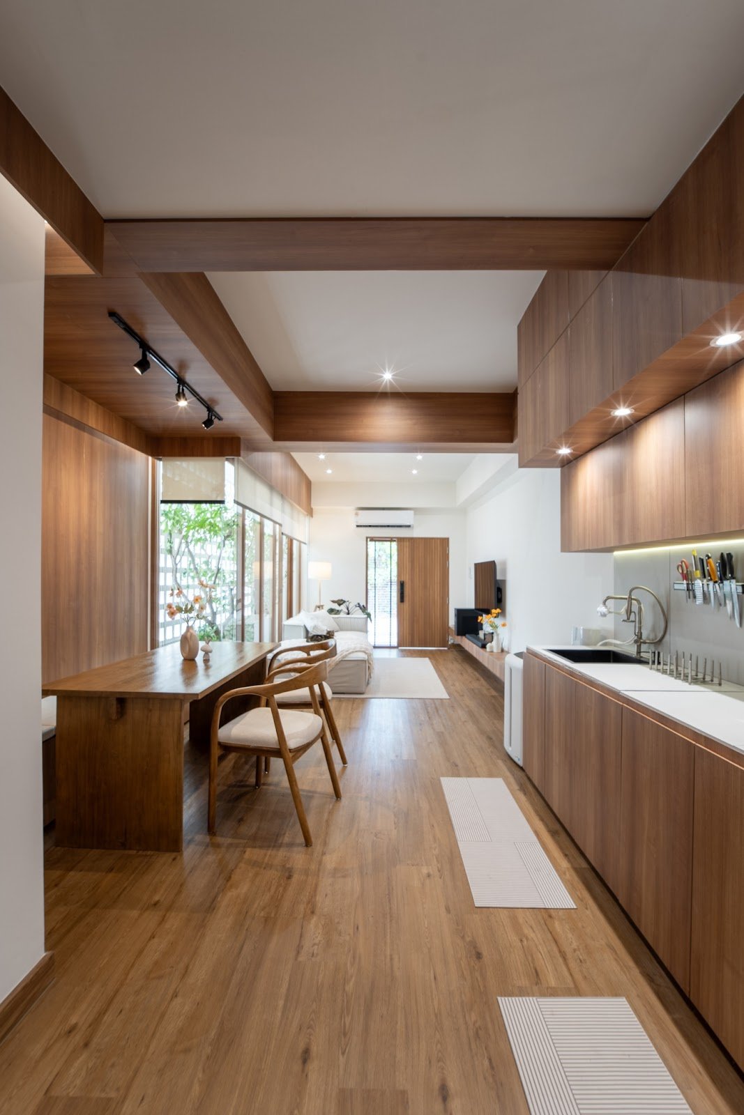 Không gian bếp - ăn và phòng khách S House nối liền thành một trục, tông gỗ ấm áp kết hợp ánh sáng trần giúp căn hộ nhỏ thêm sâu và thoáng rộng