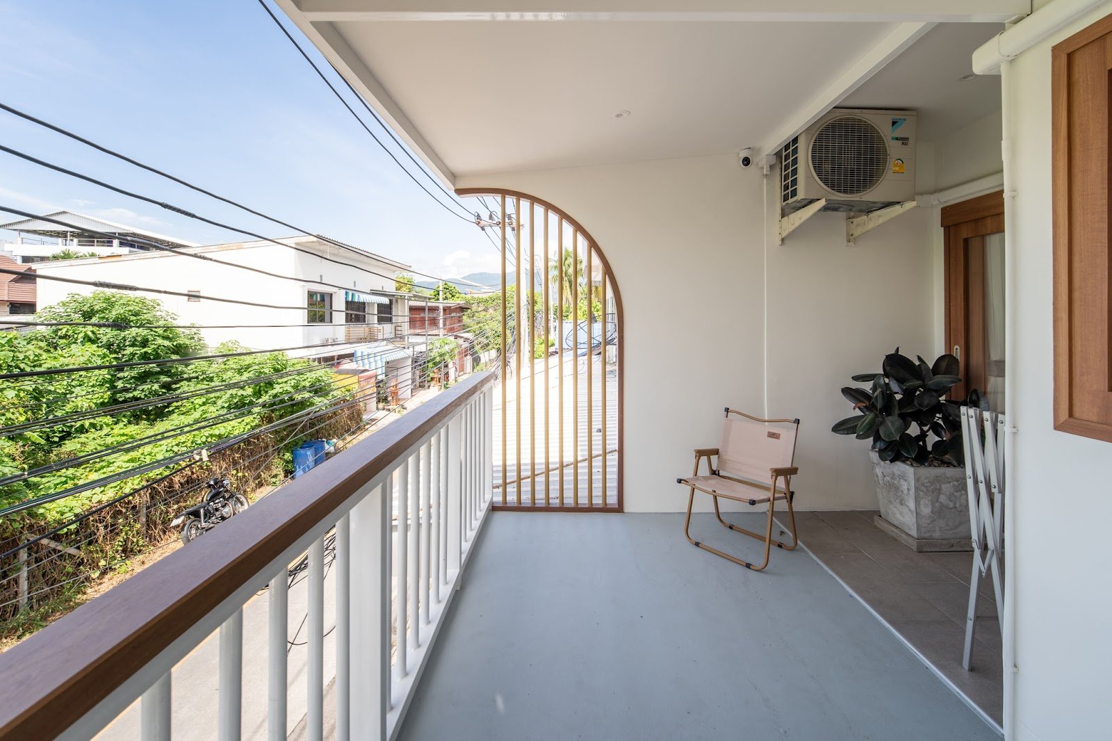 Góc nhìn từ ban công hướng ra phố với lan can trắng và chi tiết lam gỗ cong mềm mại. Không gian ngoài trời của S House là nơi hít thở, đọc sách và thư giãn mỗi sáng