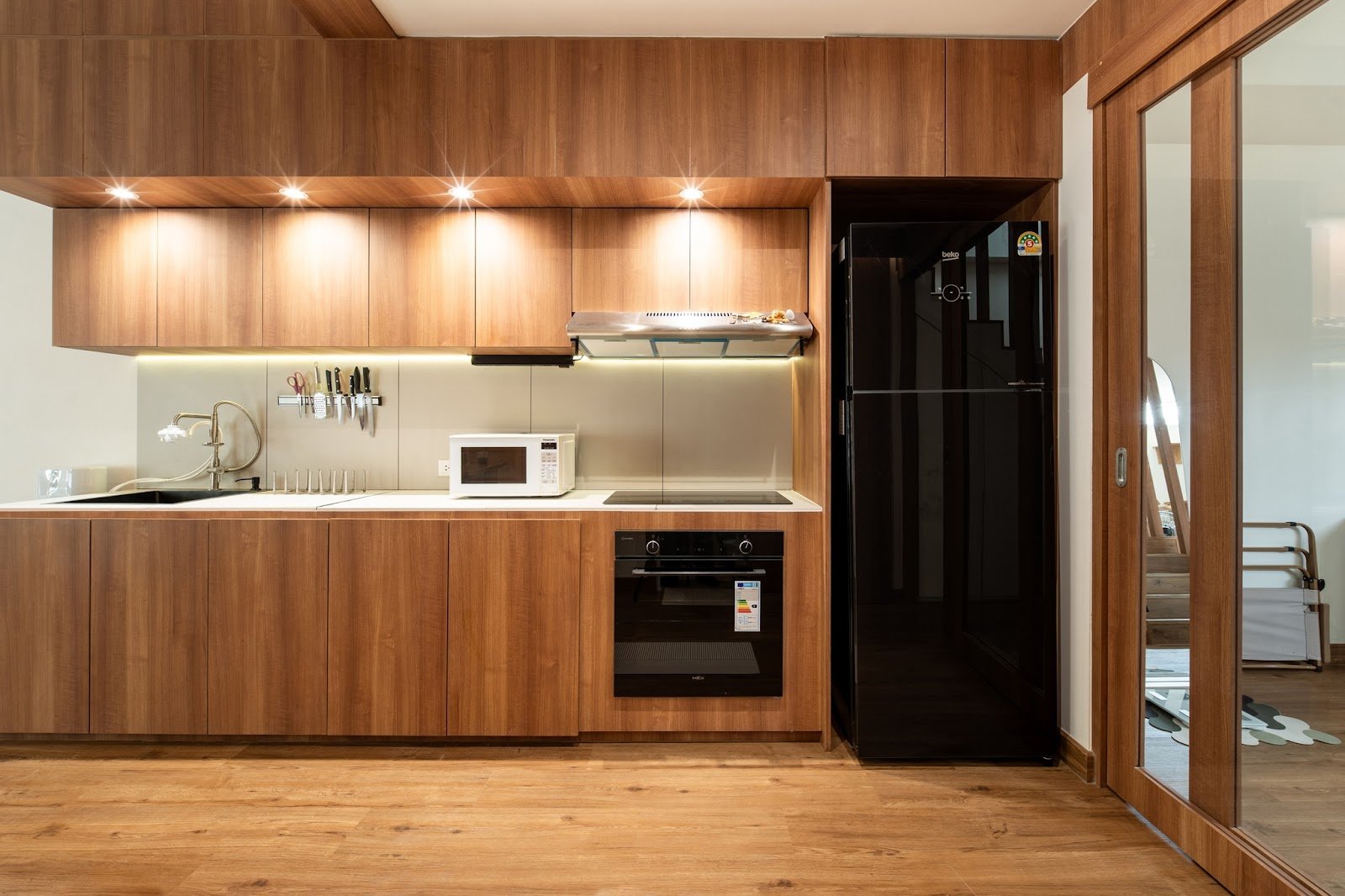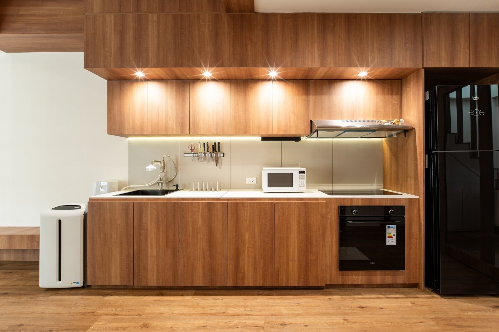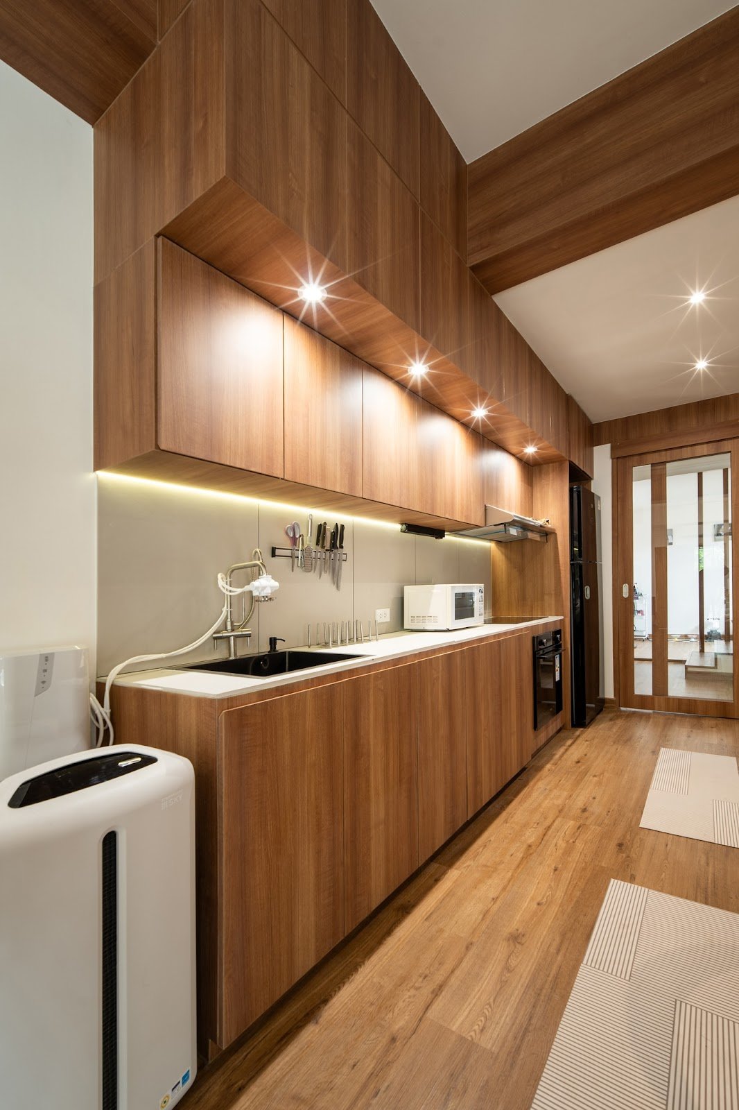 Khu bếp gọn gàng trong S House với hệ tủ gỗ liền mạch, ánh đèn hắt ấm và thiết bị hiện đại như lò nướng, bếp từ và lò vi sóng, đảm bảo công năng tối ưu