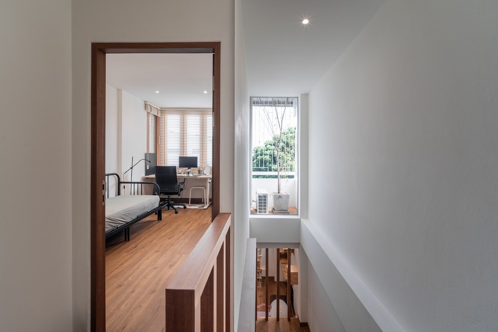 Lối lên cầu thang dẫn đến phòng làm việc tầng trên, ánh sáng tự nhiên chiếu qua cửa sổ và khoảng thông tầng giúp không gian luôn sáng và thoáng khí