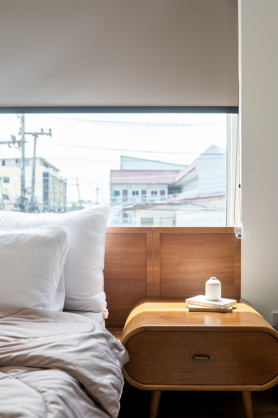 Góc đầu giường trong phòng ngủ S House với tab gỗ bo tròn, đèn ngủ và sách decor, cửa sổ lớn đón ánh sáng buổi sáng vào không gian nghỉ ngơi ấm áp