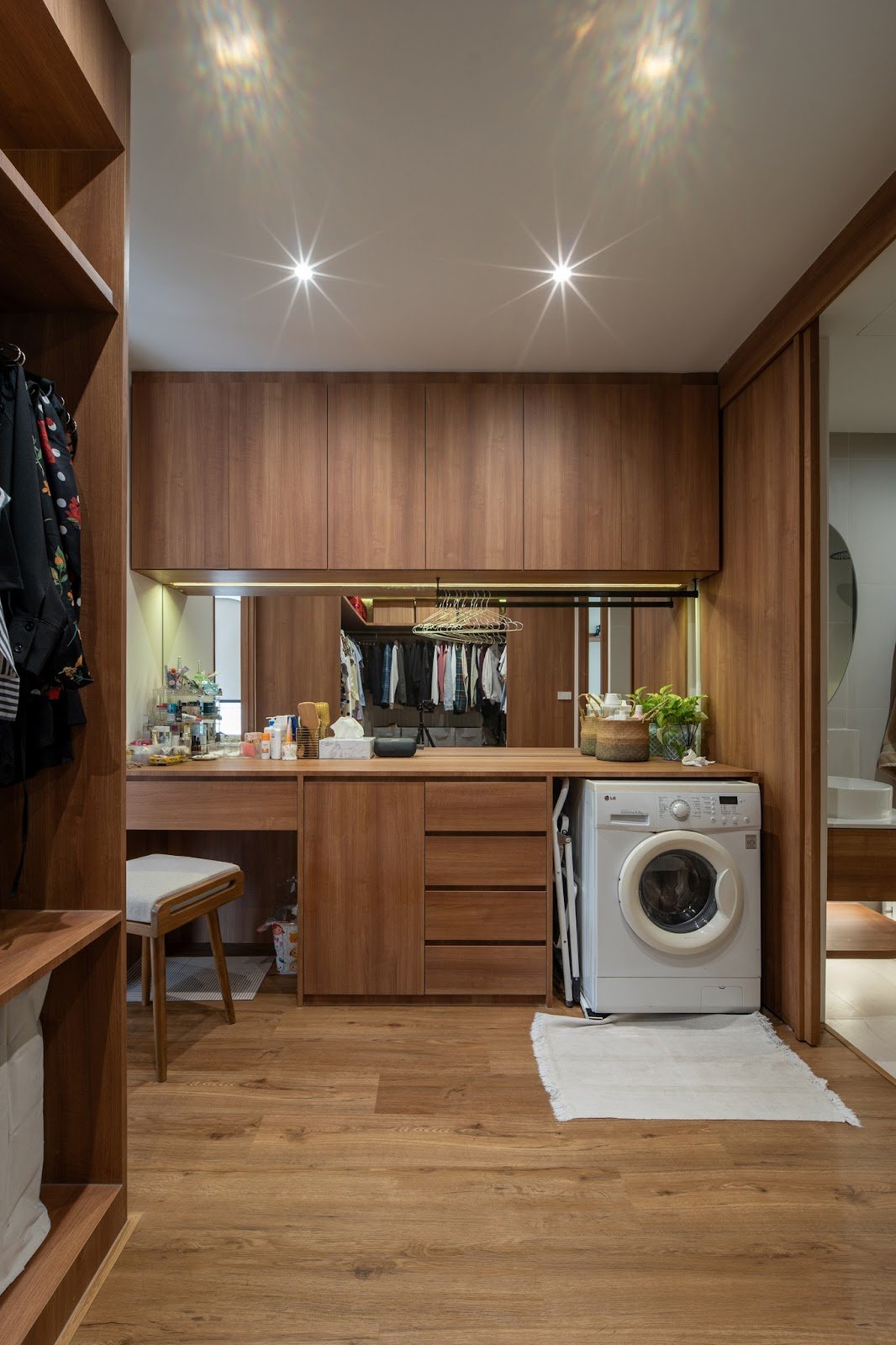 Một trong những điểm thú vị của S House là cách bố trí chuỗi không gian chức năng nối tiếp nhau - từ tủ đồ, máy giặt đến phòng tắm. Tất cả được gói gọn trong tông gỗ trầm và ánh sáng hắt nhẹ, mang lại cảm giác riêng tư nhưng không bí bách.