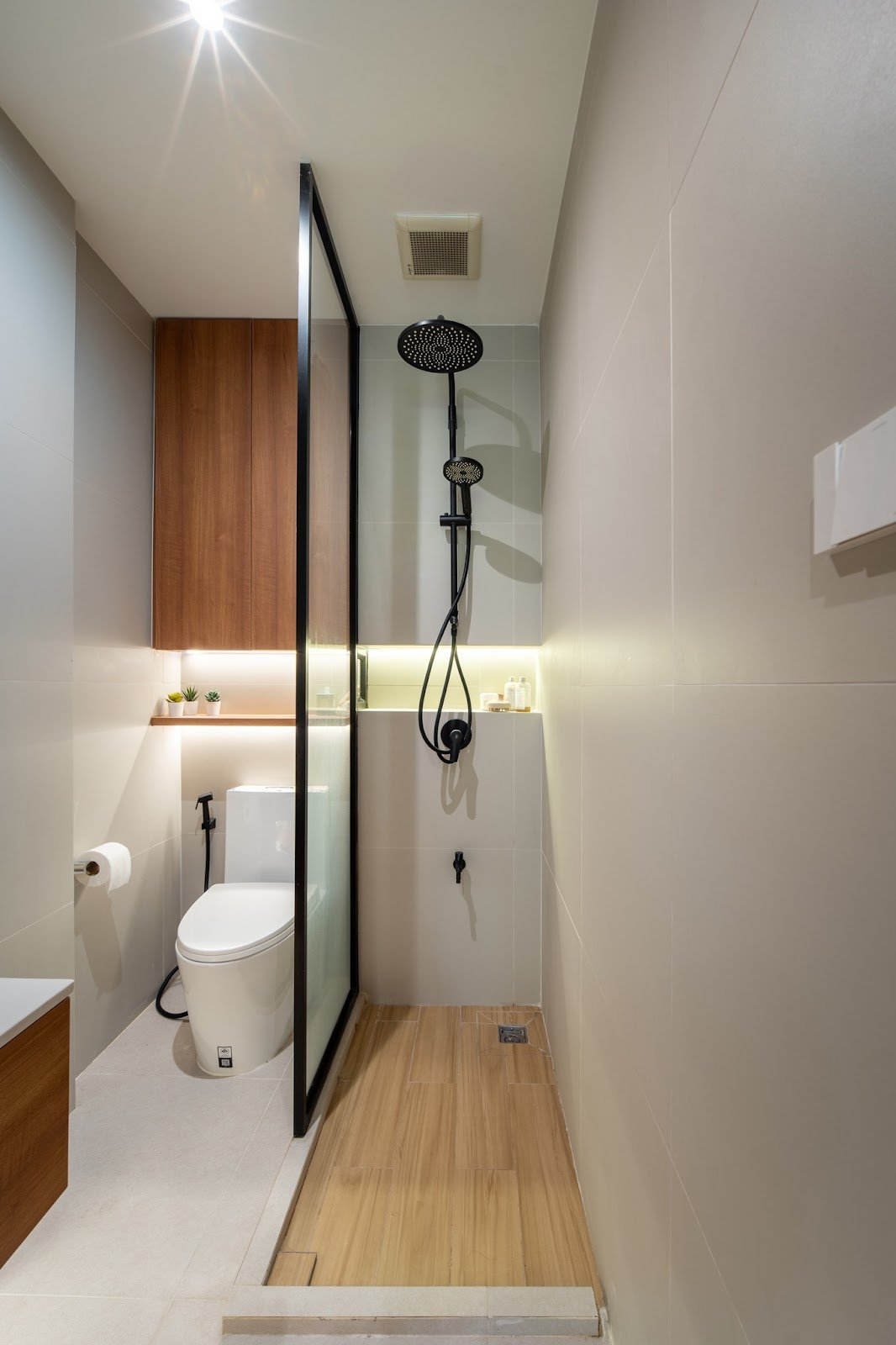 Phòng tắm S House được thiết kế tối giản với khu tắm đứng lát gỗ chống trượt, vòi sen đen mờ và vách kính ngăn, mang lại cảm giác hiện đại trong không gian hẹp