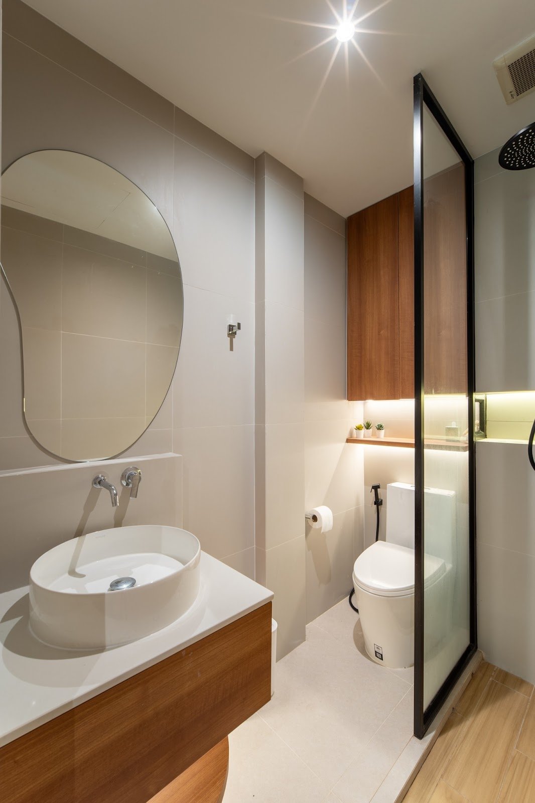 Phòng tắm phối hợp giữa gỗ và gạch sáng màu, lavabo nổi đặt trên tủ treo cùng gương tròn lệch hiện đại, tạo cảm giác tinh tế và tiện nghi