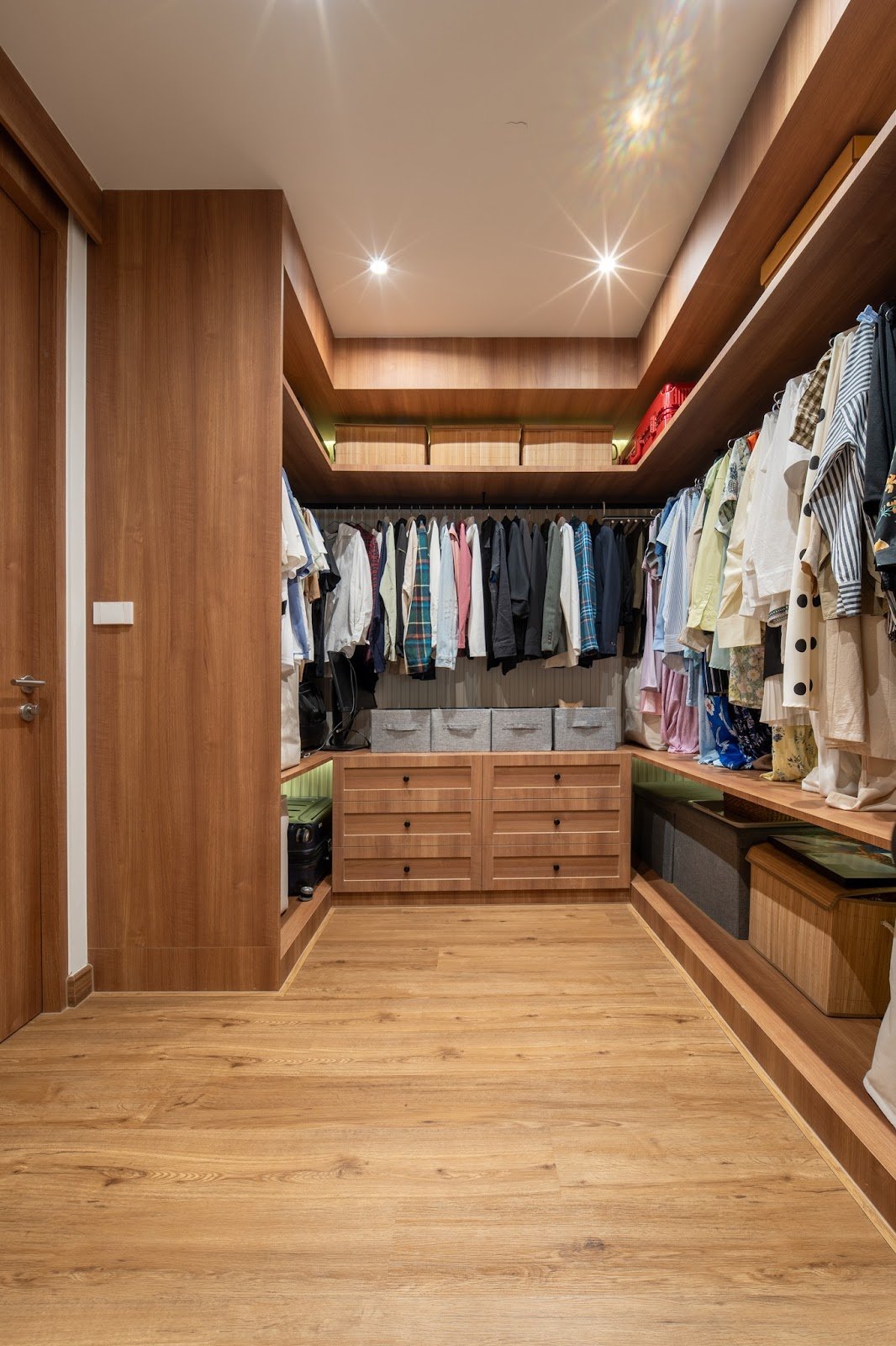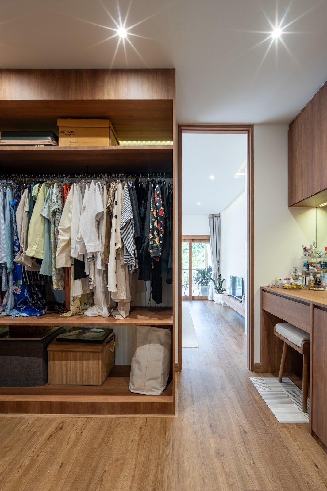 Tủ quần áo walk-in của S House thiết kế đồng bộ bằng gỗ tự nhiên, bố trí hộc kéo và giá treo thông minh giúp tối ưu lưu trữ trong diện tích nhỏ