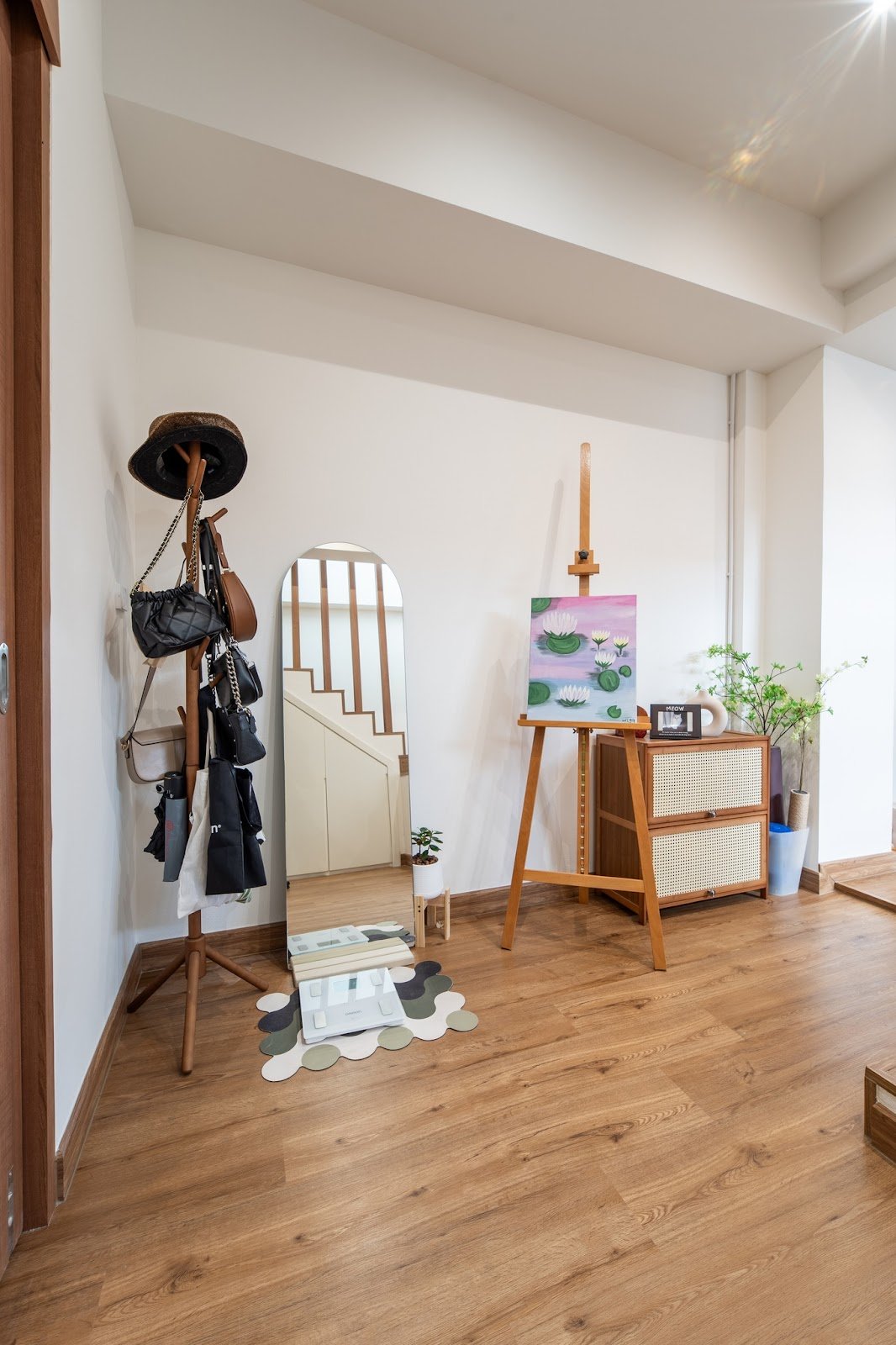 Góc sinh hoạt nhỏ trong S House với giá treo đồ, gương đứng, kệ mây phối gỗ và giá vẽ tranh, thể hiện cá tính nghệ thuật và nếp sống gọn gàng của gia chủ
