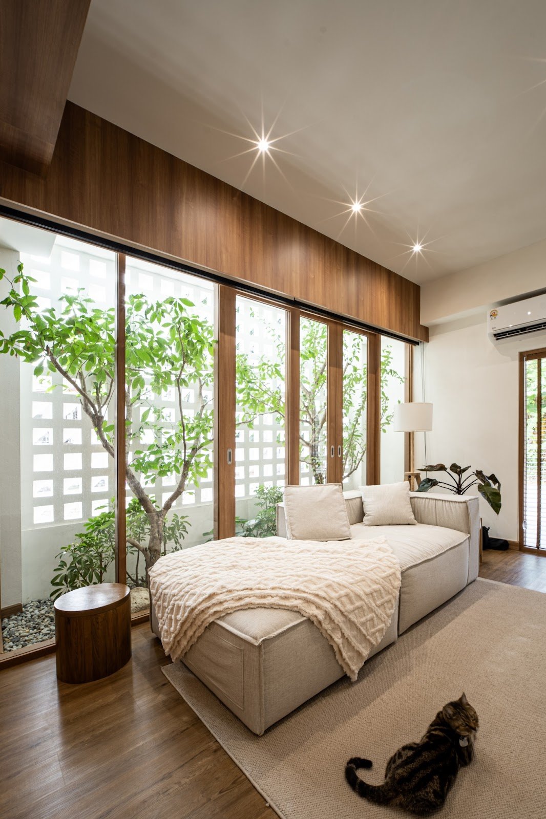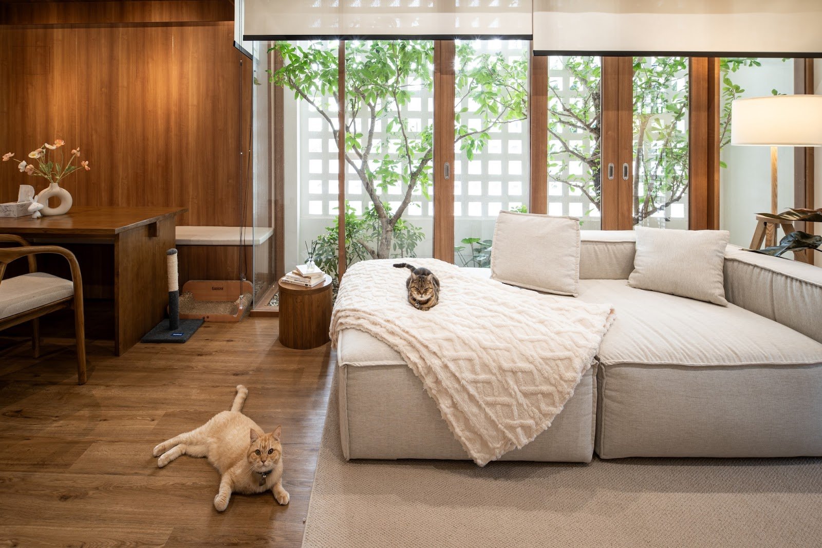 Phòng khách ngập ánh sáng với sofa lớn và hai chú mèo thư giãn cạnh khung cửa kính mở ra vườn nhỏ. Sự kết hợp giữa gỗ Teak và cây xanh tạo nên không gian ấm cúng, an lành