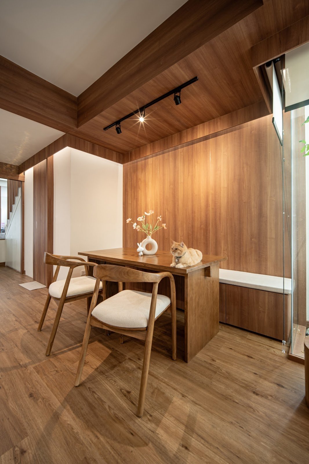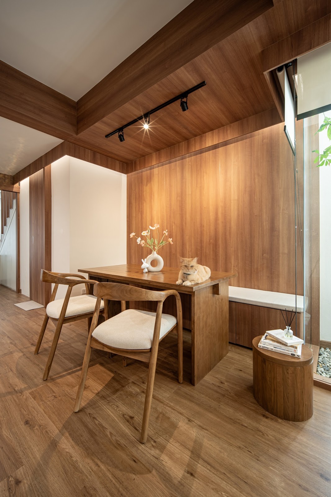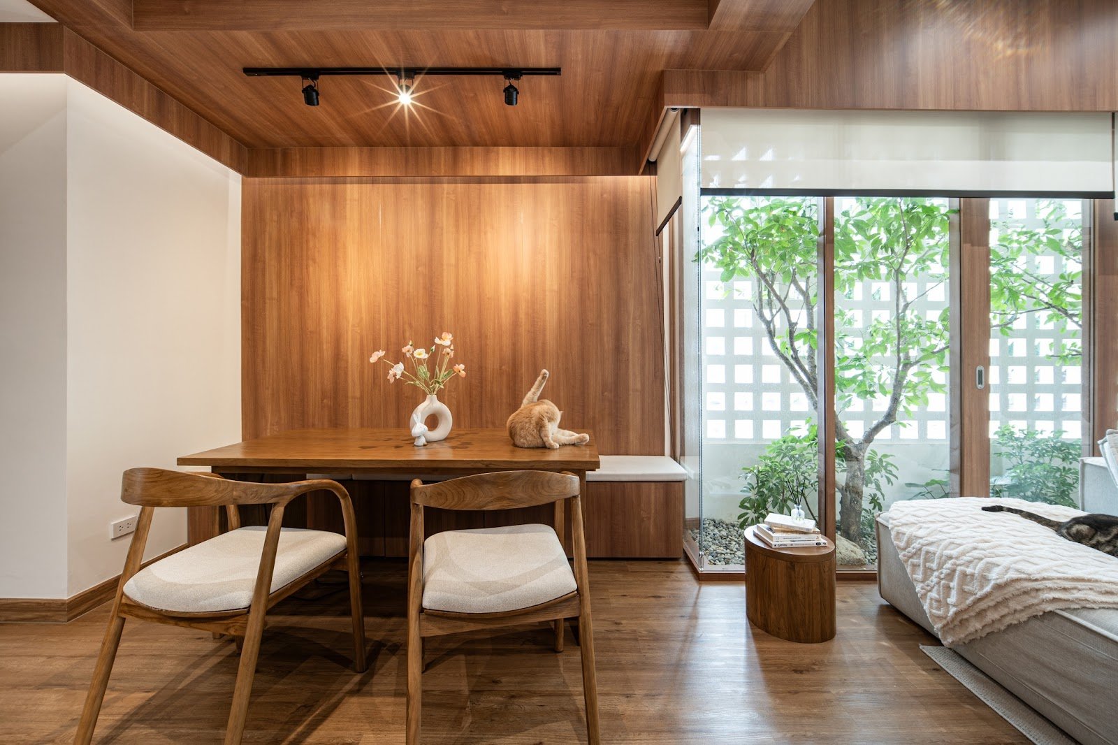 Bàn ăn nhỏ bằng gỗ tại S House được đặt cạnh cửa kính hướng vườn, nơi chú mèo của chủ nhà thường nằm phơi nắng, tạo nên góc sống thân mật và yên bình