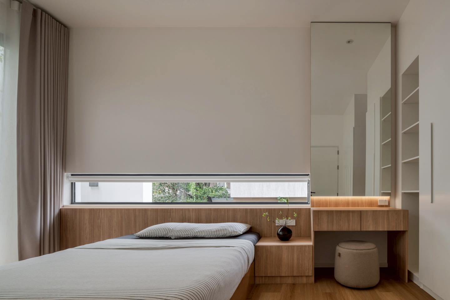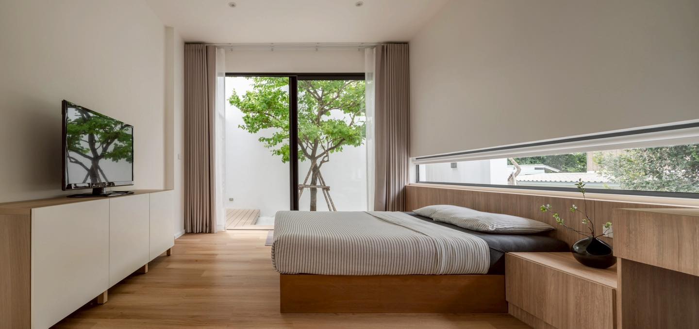 Phòng ngủ sử dụng tông gỗ sáng kết hợp gam trắng tinh giản, tạo cảm giác ấm áp và thư giãn. Cửa sổ ngang thấp giúp lấy sáng tự nhiên mà vẫn đảm bảo riêng tư cho không gian nghỉ ngơi