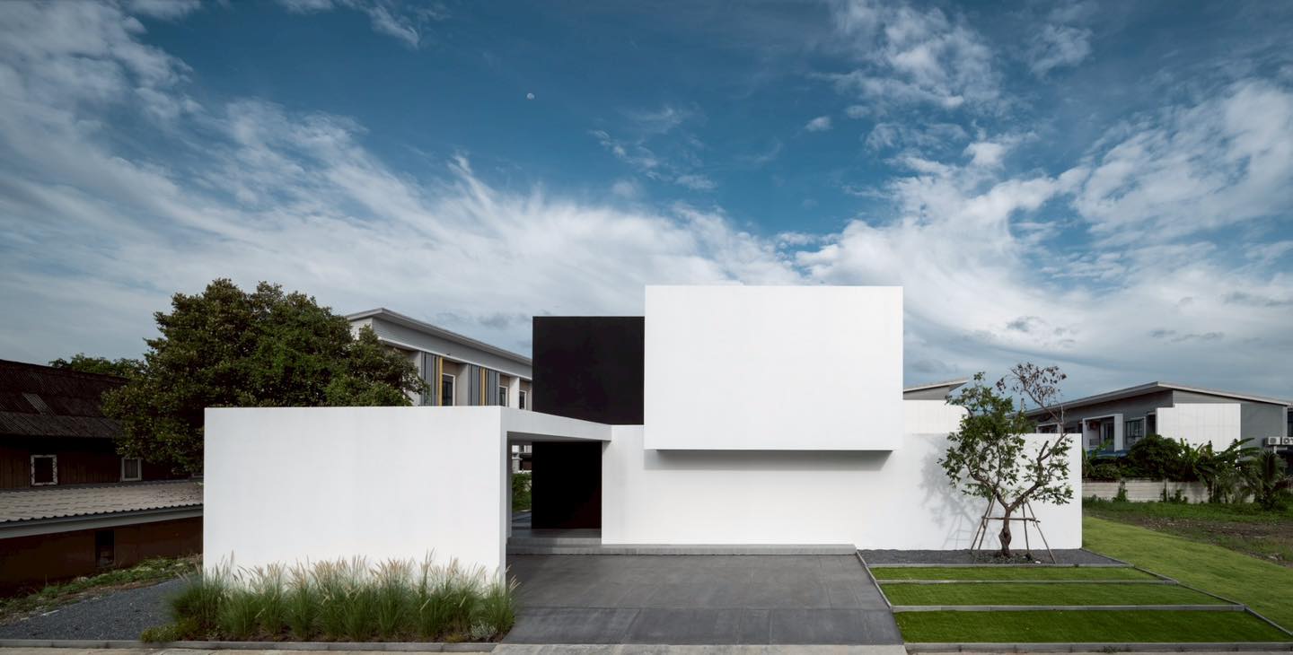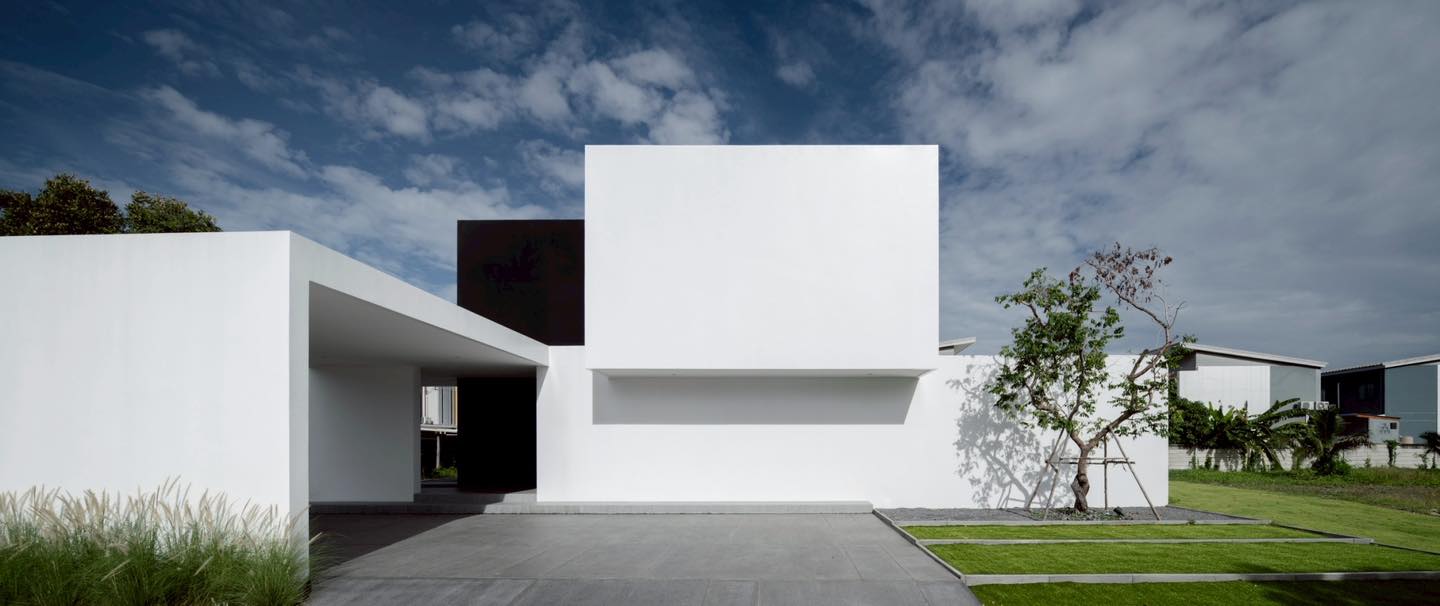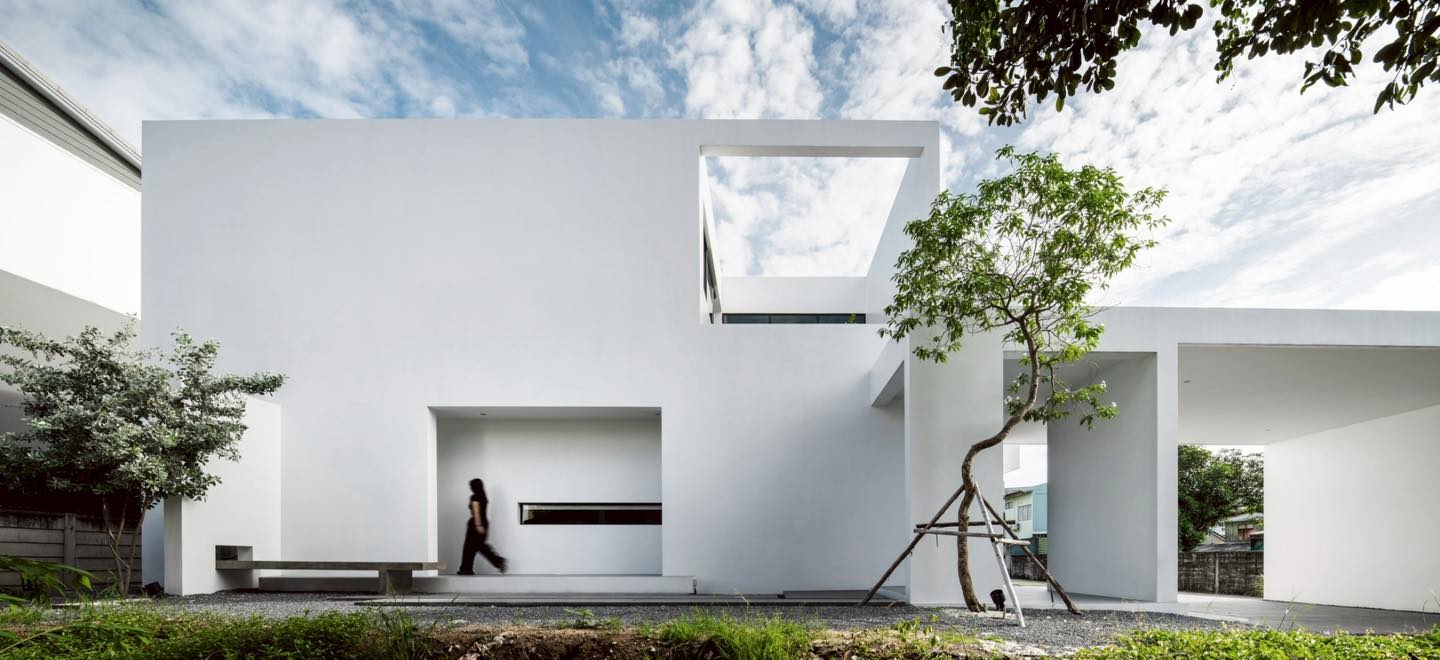 Mặt tiền nhà House Yolk nổi bật với khối hộp trắng phẳng, tối giản, được cắt gọt tinh tế để tạo khung trời mở phía trên. Thiết kế khép kín giúp đảm bảo riêng tư cho gia chủ nhưng vẫn cho phép ánh sáng và gió tự nhiên len vào bên trong