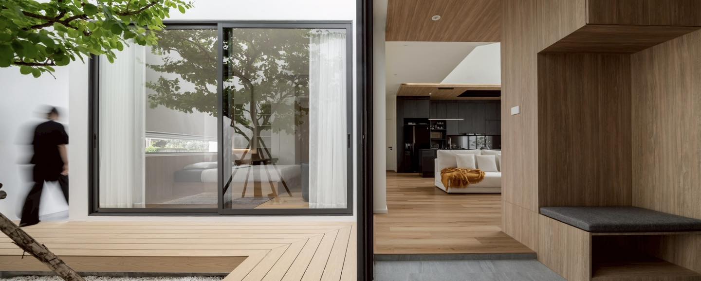 Hành lang gỗ dẫn ra khoảng sân trong với cây xanh - điểm nhấn “lá phổi xanh” cho toàn bộ ngôi nhà. Thiết kế mở liên kết trực quan giữa nội thất và thiên nhiên, mang lại cảm giác tĩnh lặng