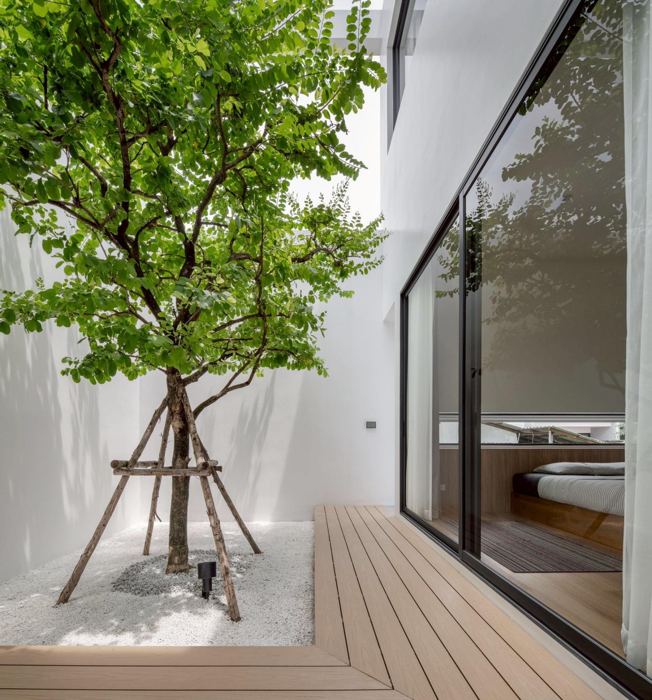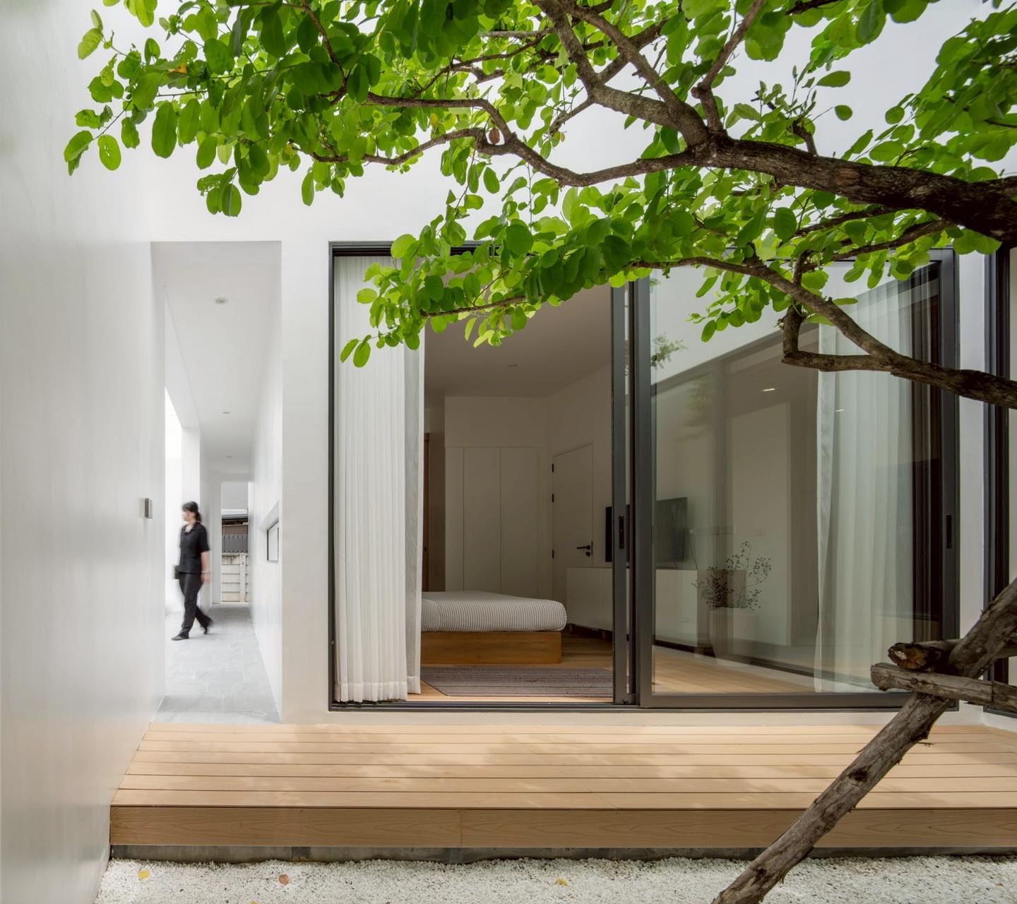 Khoảng sân giữa chính là điểm hội tụ ánh sáng và sự bình yên. Một gốc cây lớn vươn tán giữa nền sỏi trắng, vừa giúp điều hòa không khí, vừa tạo góc nhìn đẹp cho mọi phòng.