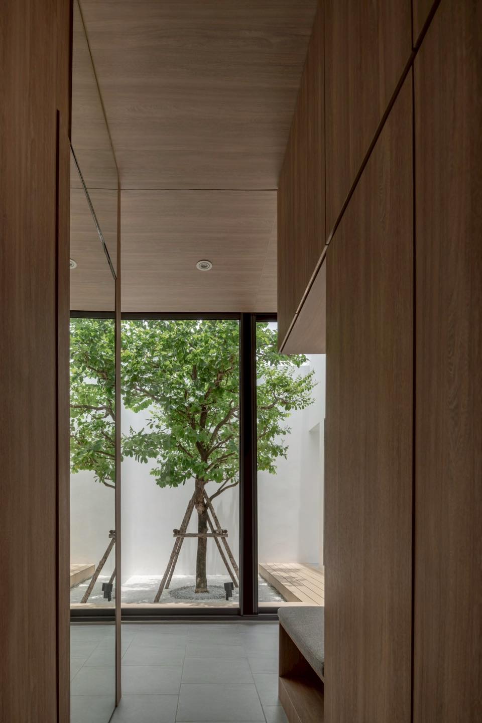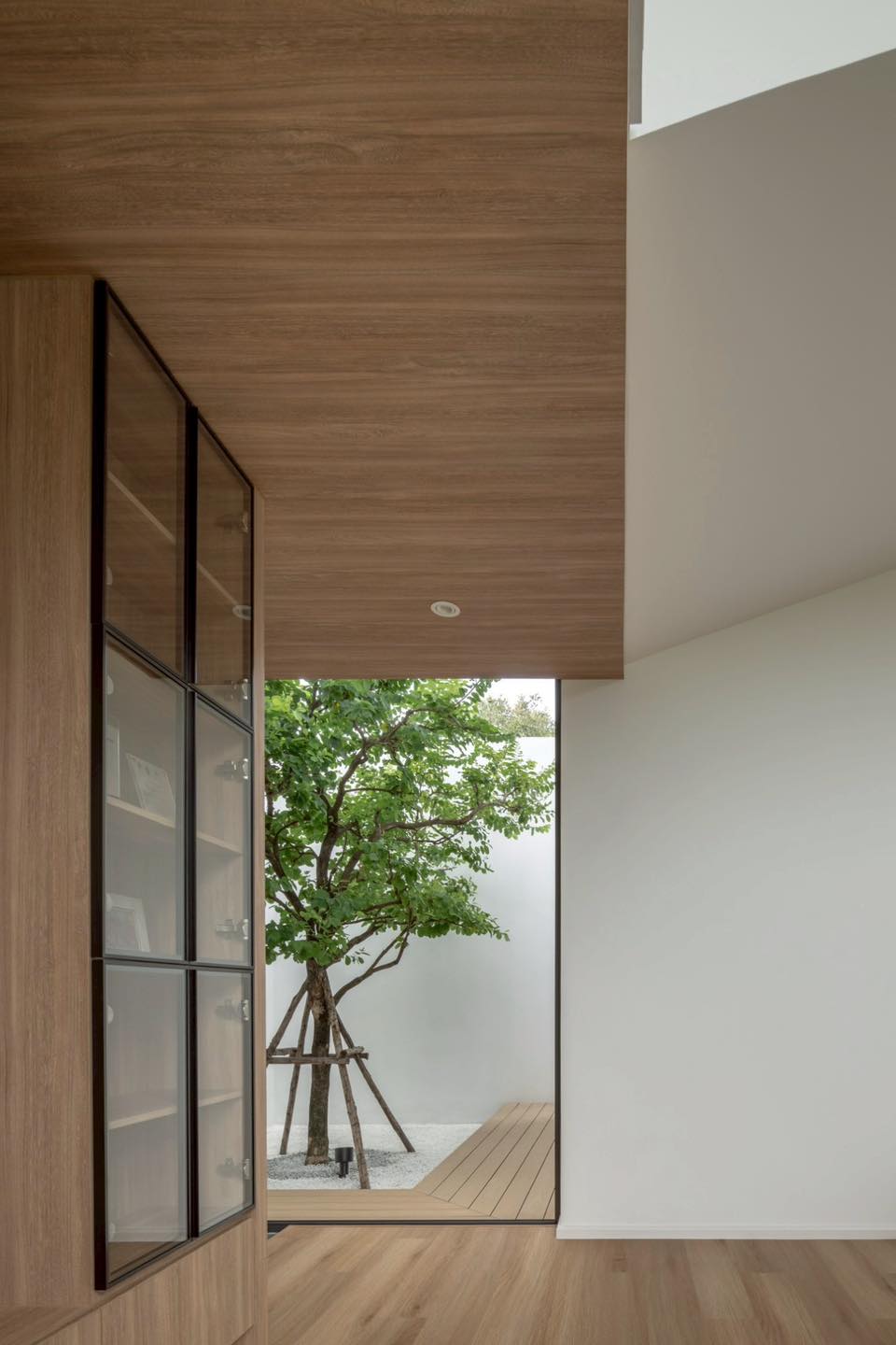 Từ góc nhìn cạnh tủ kính, người xem có thể thấy rõ mối liên hệ giữa nội thất gỗ và sân trong xanh mát. Cách mở tầm nhìn thẳng ra cây xanh giúp cân bằng cảm xúc, khiến không gian sống luôn tươi mới và an yên