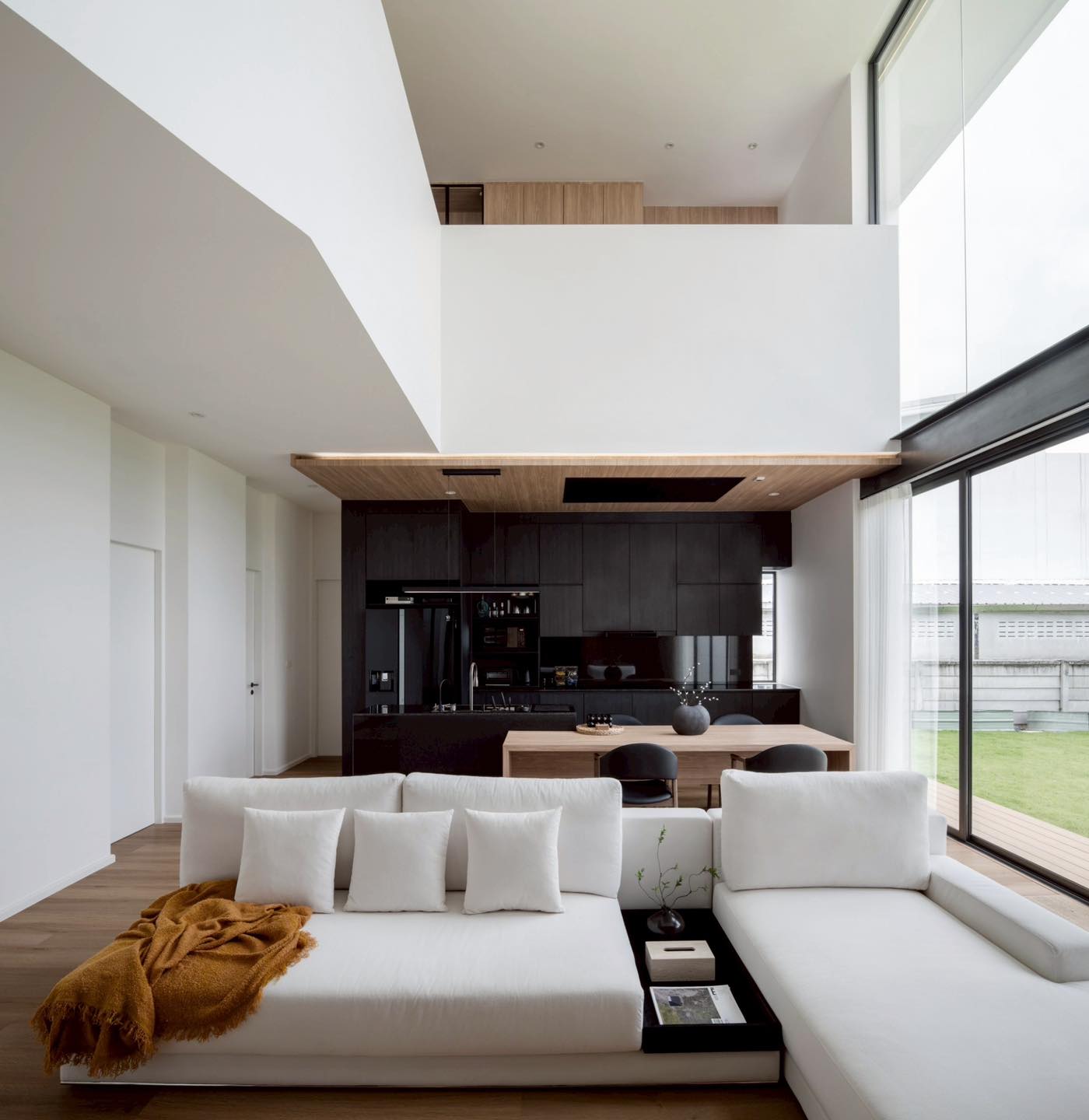 Phòng khách thông tầng kết nối trực tiếp với bếp - ăn, tạo không gian sinh hoạt chung mở và liền mạch. Tông trắng, đen và gỗ phối hợp hài hòa mang lại vẻ sang trọng nhưng vẫn ấm cúng