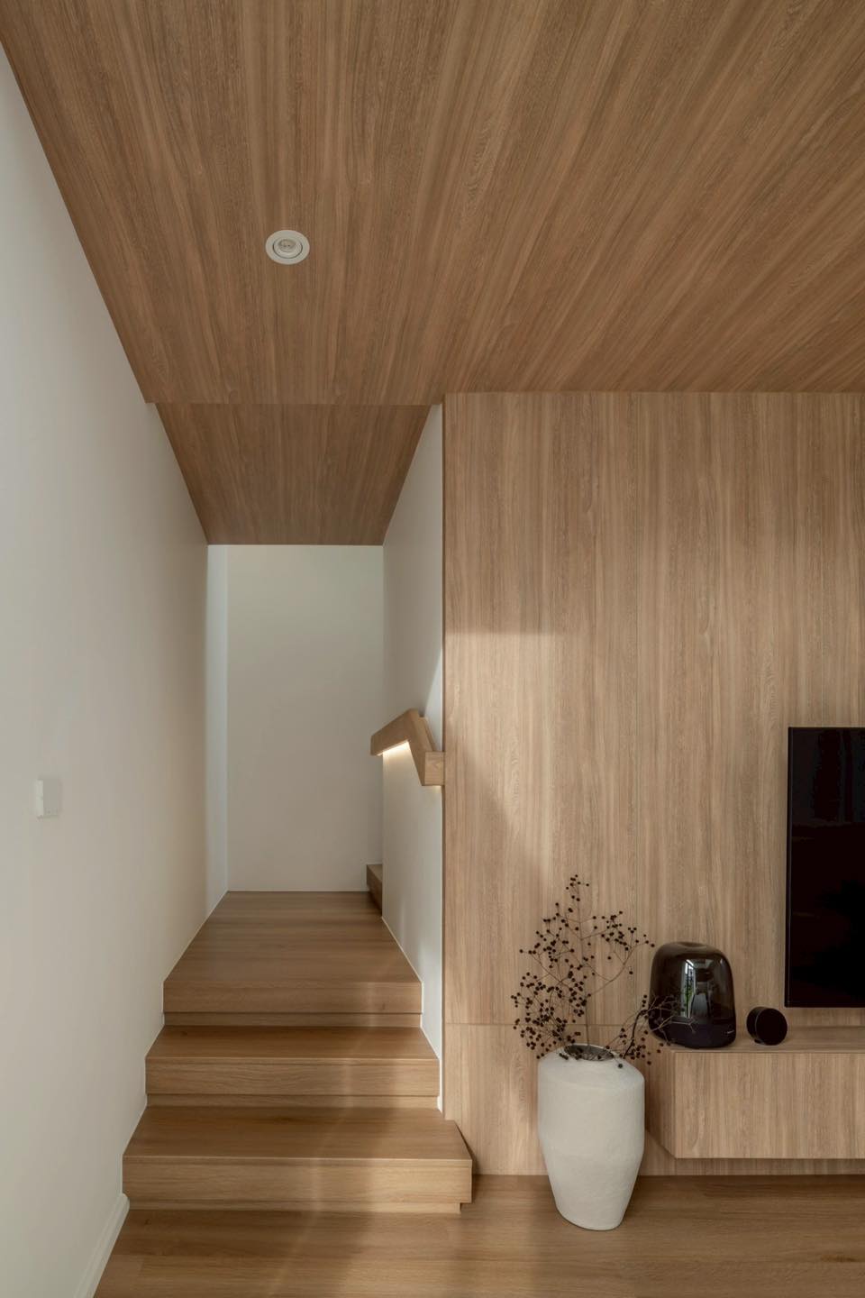 Cầu thang nhỏ bên trong được ốp gỗ đồng bộ với mảng tường và trần, tạo cảm giác liên tục và ấm áp. Ánh sáng dịu chiếu từ khe hắt tường khiến lối đi thêm sinh động