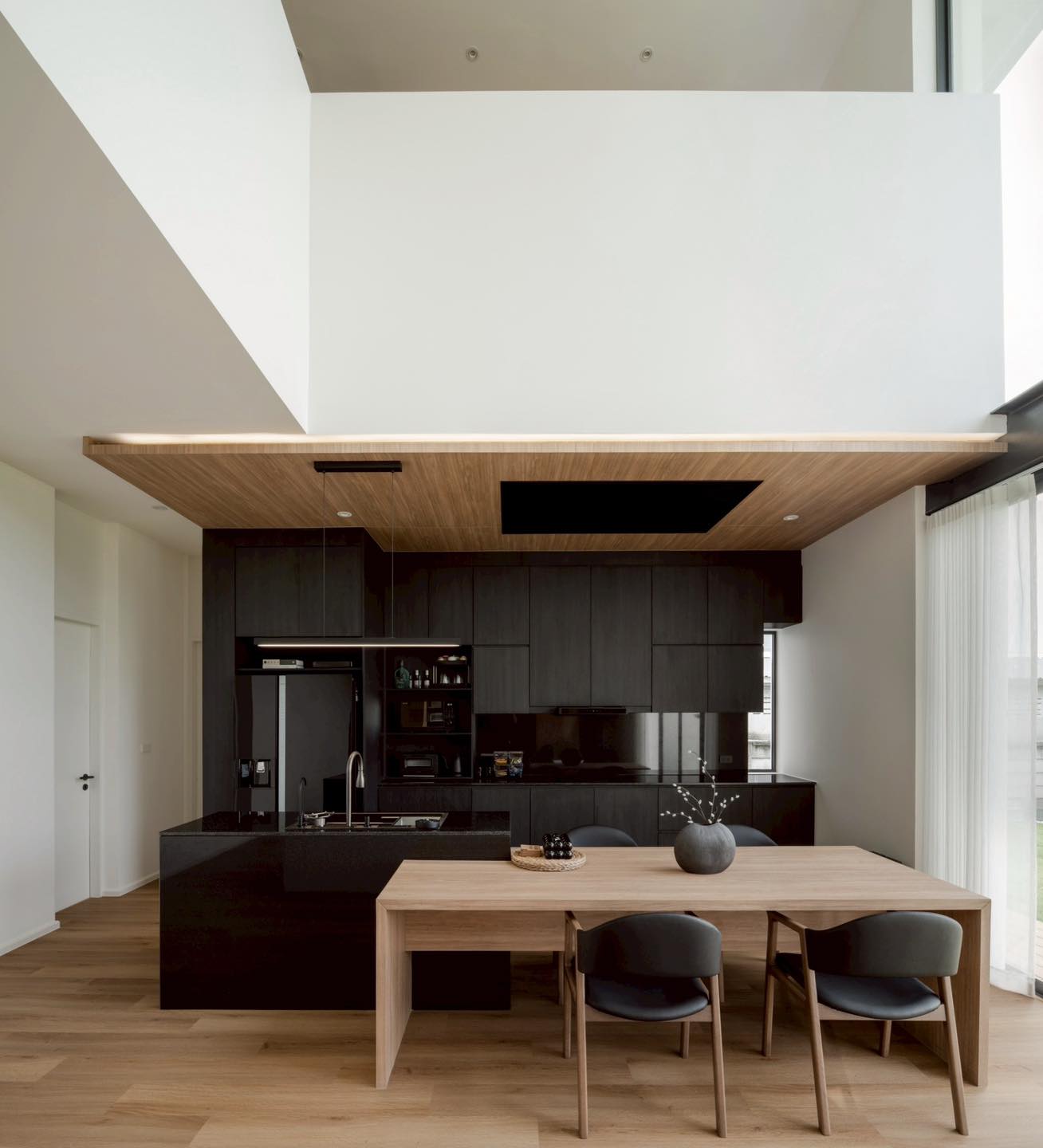 Khu bếp - bàn ăn hiện đại với sự tương phản giữa gỗ sáng và tủ bếp đen tuyền. Thiết kế trần ốp gỗ hạ thấp giúp tạo điểm nhấn thị giác và định khung khu vực nấu nướng