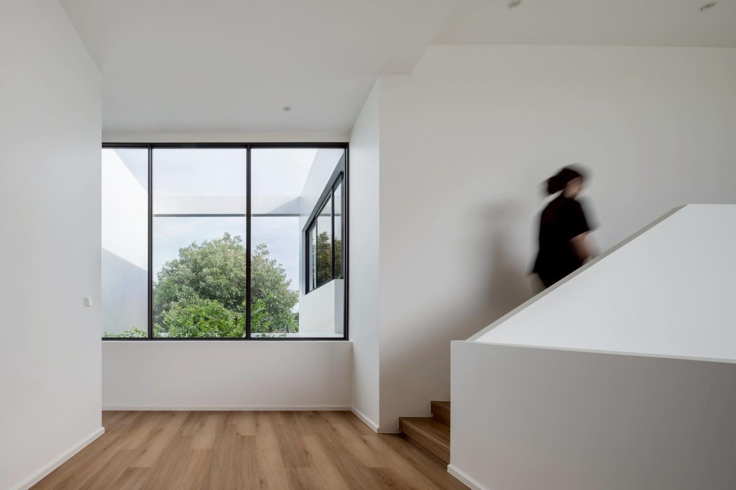 Không gian cầu thang tầng trên đón ánh sáng tự nhiên qua mảng kính lớn, giúp hành lang luôn sáng và thoáng khí. Thiết kế tối giản với tông trắng chủ đạo làm nổi bật chất liệu sàn gỗ ấm áp