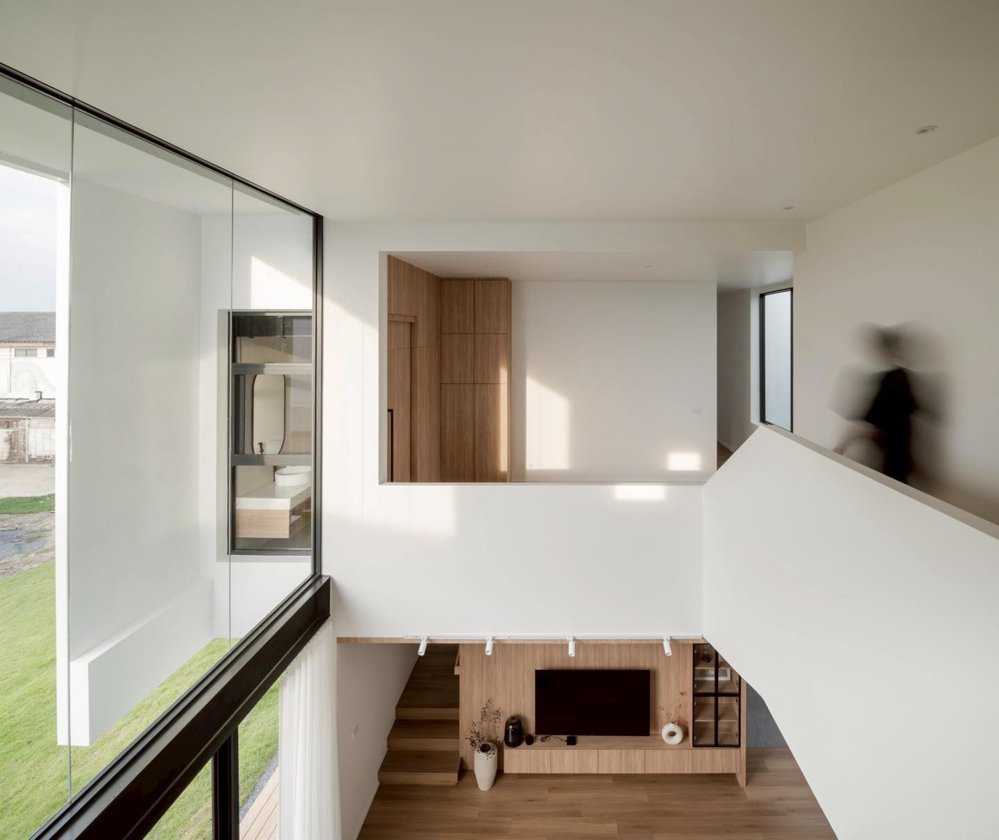 Tầng 2 của ngôi nhà được thiết kế mở, nhìn xuống phòng khách qua vách kính lớn. KTS tận dụng chênh lệch cao độ và ánh sáng để tạo cảm giác rộng và liên kết giữa các tầng mà không cần vách ngăn kín