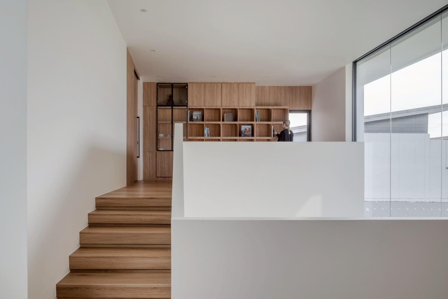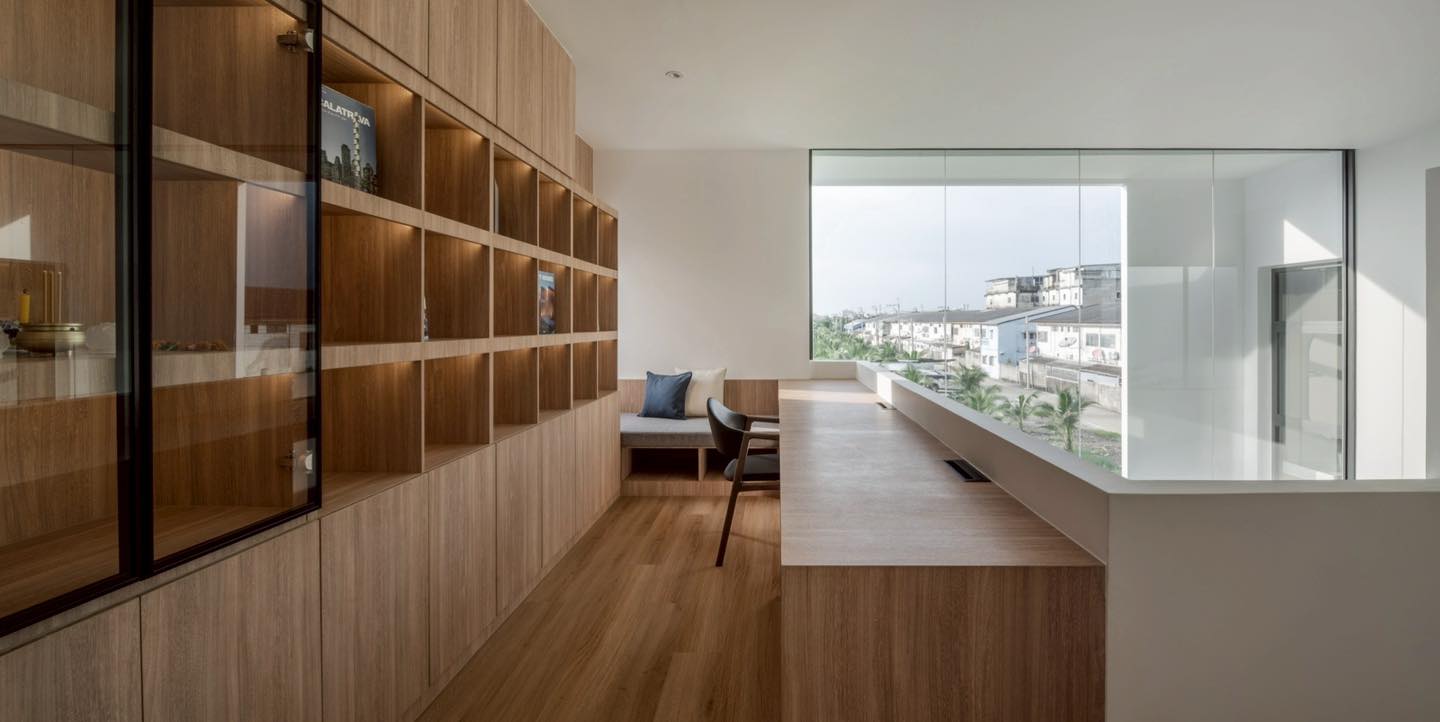 Góc làm việc và thư viện trên tầng hai với tủ kệ gỗ chạy dài và cửa kính lớn nhìn ra cảnh quan khu phố. Không gian kết hợp giữa chức năng lưu trữ, thư giãn và ngắm nhìn ánh sáng tự nhiên