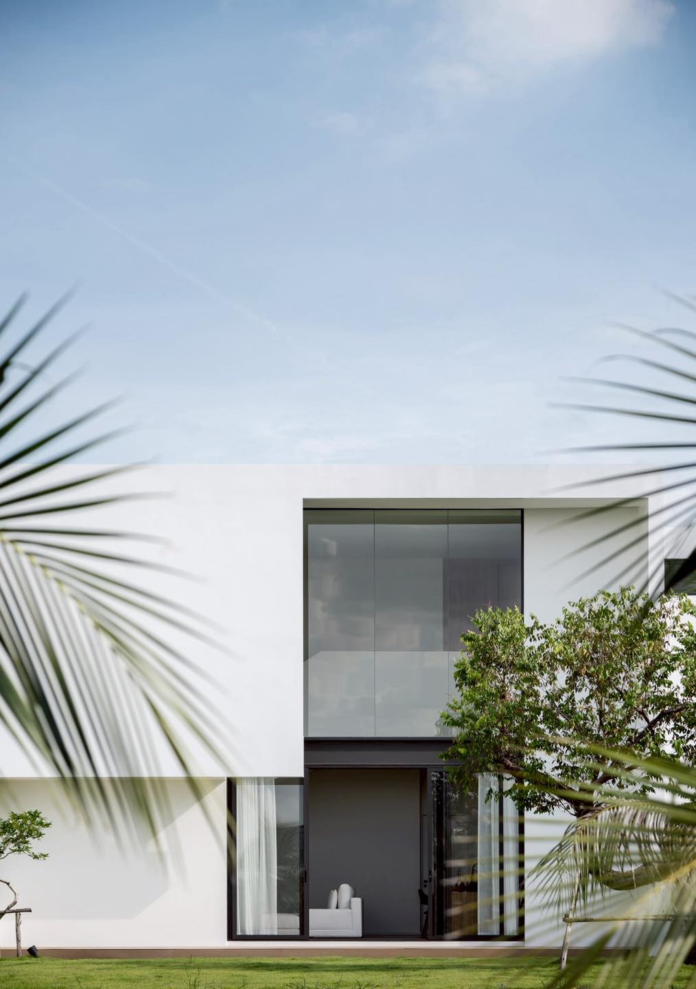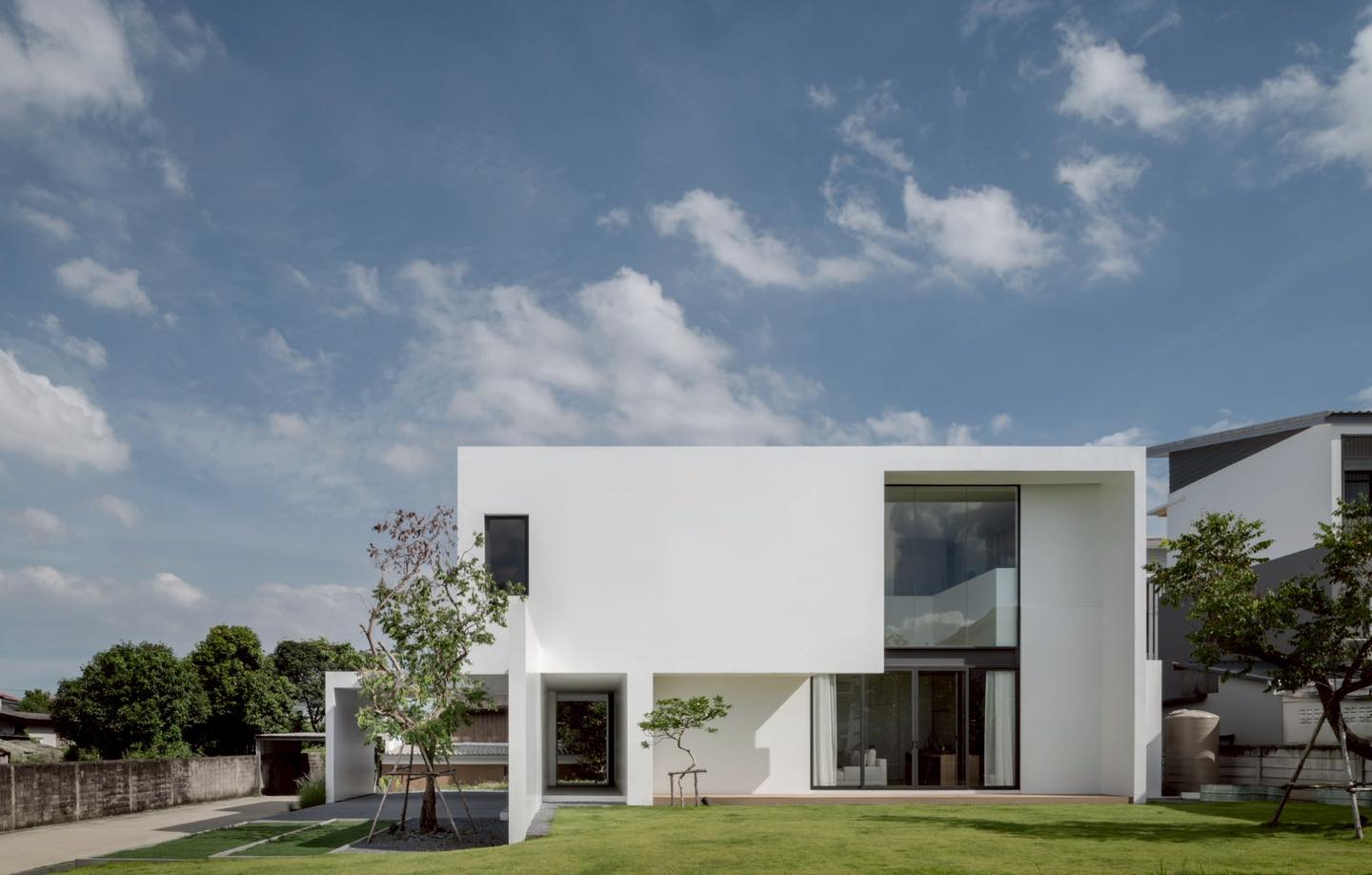Mặt tiền sau ngôi nhà với khối hộp trắng tối giản mở ra khoảng sân xanh rộng thoáng. Mảng kính lớn tầng hai phản chiếu bầu trời, giúp kết nối thị giác giữa nội thất và cảnh quan thiên nhiên