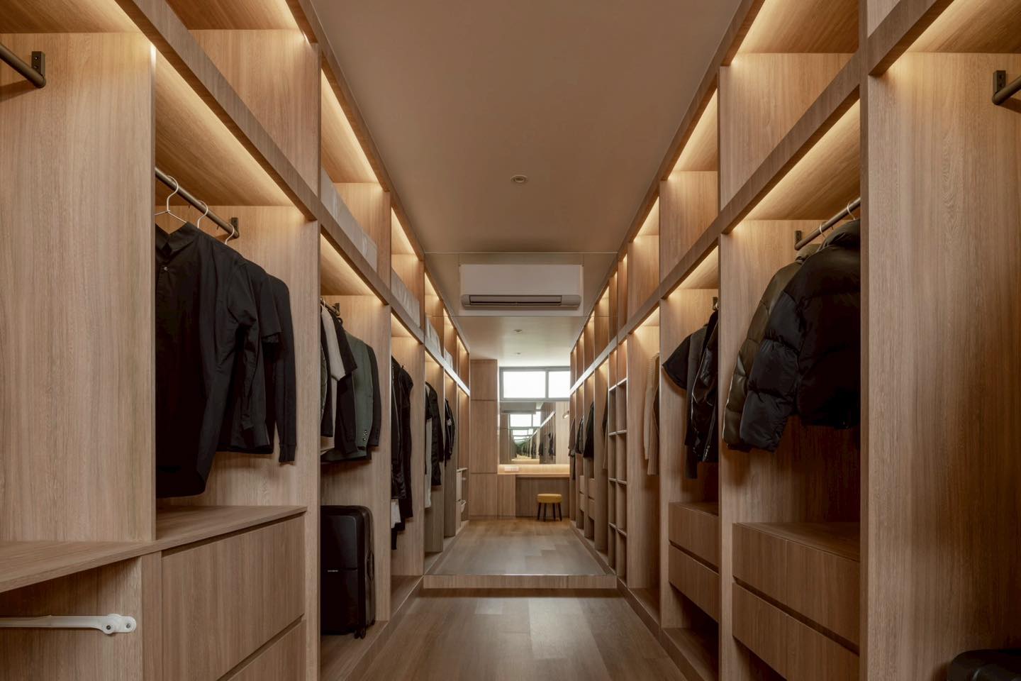 Phòng thay đồ bố trí dọc hành lang với hệ tủ gỗ sáng và ánh sáng vàng dịu, tạo cảm giác sang trọng như một boutique cá nhân. Lối đi giữa rộng rãi giúp việc lưu trữ và di chuyển thuận tiện