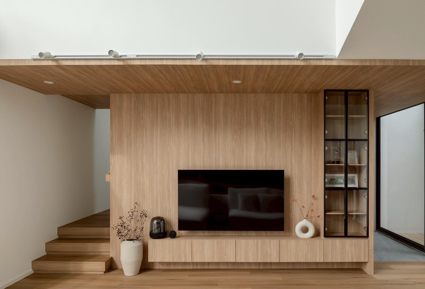 Không gian phòng khách ấm cúng với hệ ốp gỗ đồng nhất bao phủ trần, tường và kệ TV. Thiết kế tối giản nhưng khéo léo tạo cảm giác bao bọc và gần gũi - đối lập với sự lạnh lẽo của khối vỏ ngoài trắng tinh
