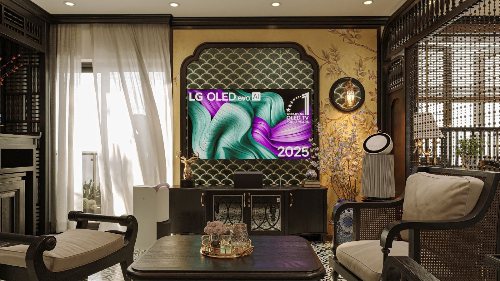 Phòng khách phong cách Đông Dương với TV LG OLED evo AI đặt trên mảng tường họa tiết vảy cá, điểm xuyết ánh vàng ấm và chi tiết gỗ chạm khắc tinh tế. Sự hòa quyện giữa công nghệ và hoài niệm tạo nên vẻ sang trọng đậm chất Á Đông.