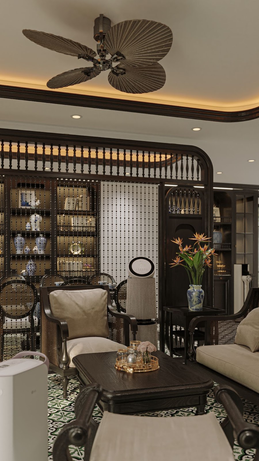• Phong cách Indochine được thể hiện qua vật liệu gỗ sẫm, họa tiết gạch bông, nan mây và ánh sáng vàng ấm.