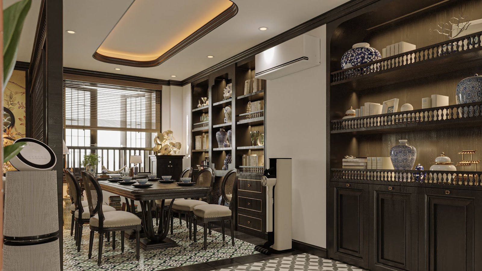 Không gian phòng ăn nối liền phòng khách qua vách ngăn hạt gỗ mềm mại, với điều hòa LG DUALCOOL bố trí tinh tế trên cao, hòa cùng hệ tủ gỗ tối và đồ gốm sứ mang đậm hơi thở Đông Dương cổ điển.