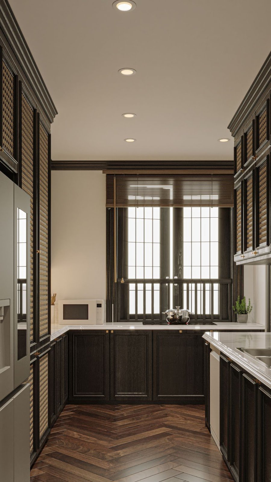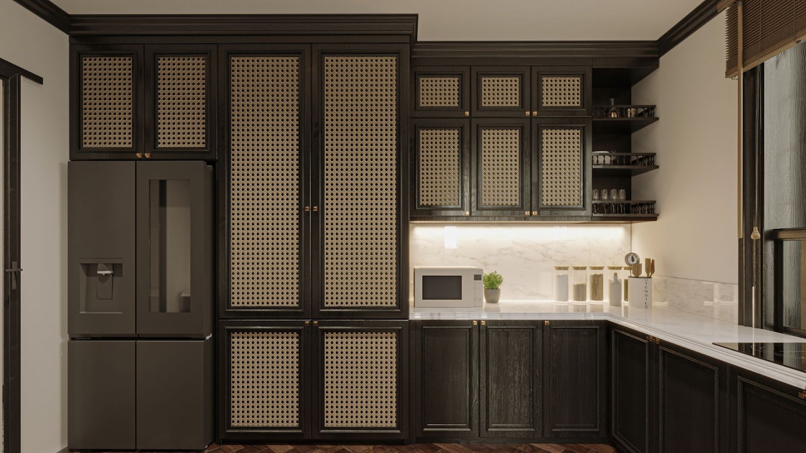 Hệ tủ bếp ốp mây và tủ lạnh LG French Door InstaView ẩn tinh tế trong tổng thể, vừa giữ nét cổ điển của phong cách Indochine vừa đảm bảo tiện nghi hiện đại cho gia chủ. Gam màu trầm tạo cảm giác sang trọng và gần gũi.