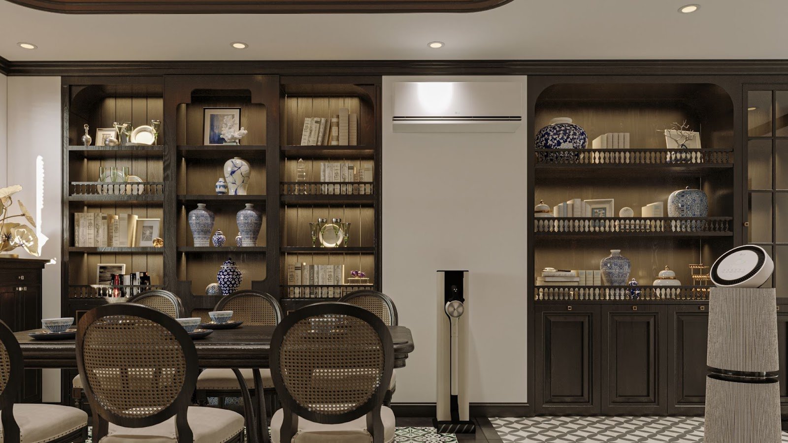 Phòng ăn và khu trưng bày đồ gốm sứ được bố trí hài hòa, nổi bật với máy hút bụi LG CordZero All-in-one Tower màu kem thanh lịch – chi tiết nhỏ nhưng thể hiện tinh thần sống tinh gọn, hiện đại giữa không gian cổ điển.