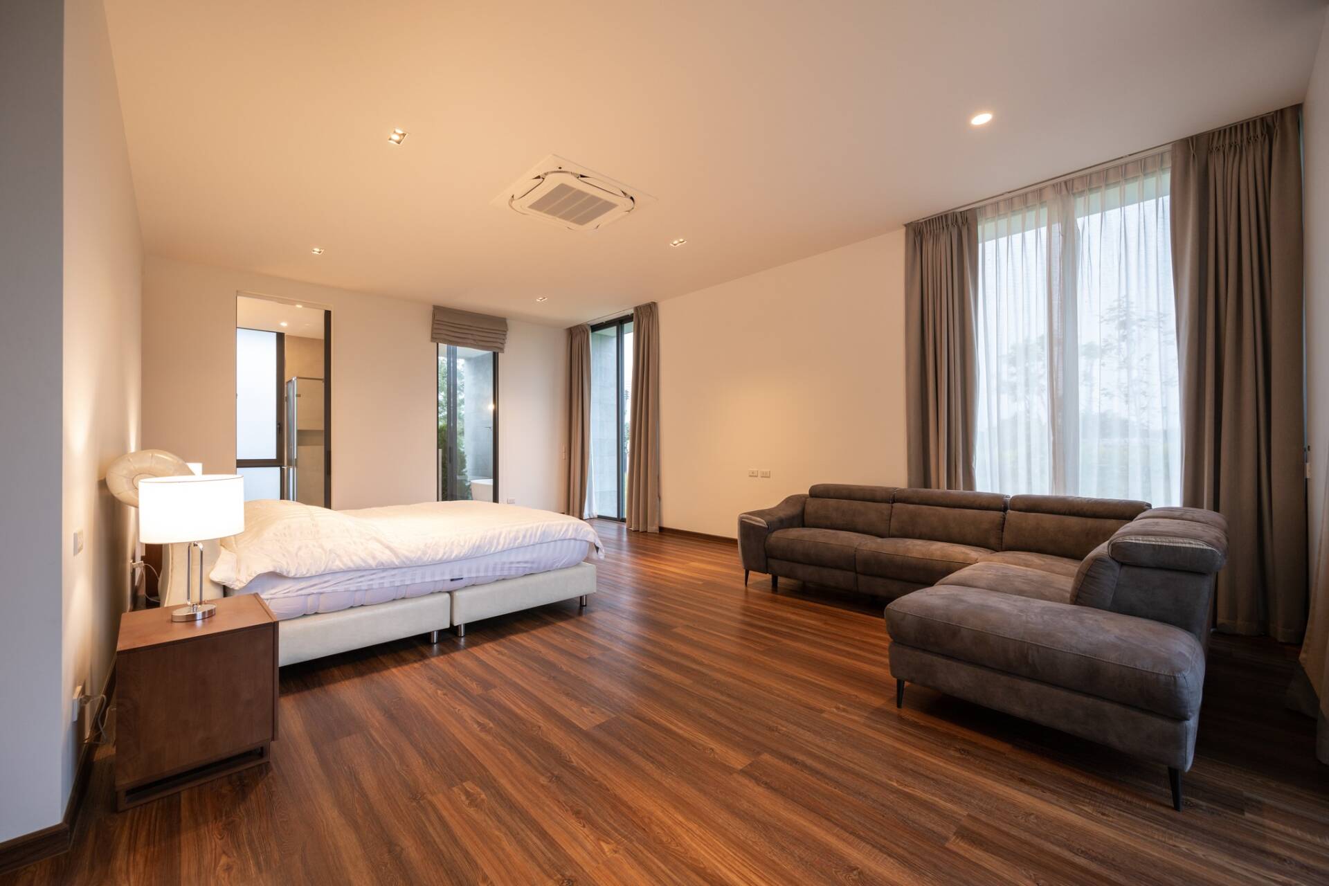 Phòng ngủ chính được thiết kế tối giản, sử dụng sàn gỗ ấm áp kết hợp nội thất màu trung tính. Ánh sáng tự nhiên tràn qua rèm cửa mỏng, giúp không gian vừa riêng tư vừa thư thái như một khu nghỉ dưỡng