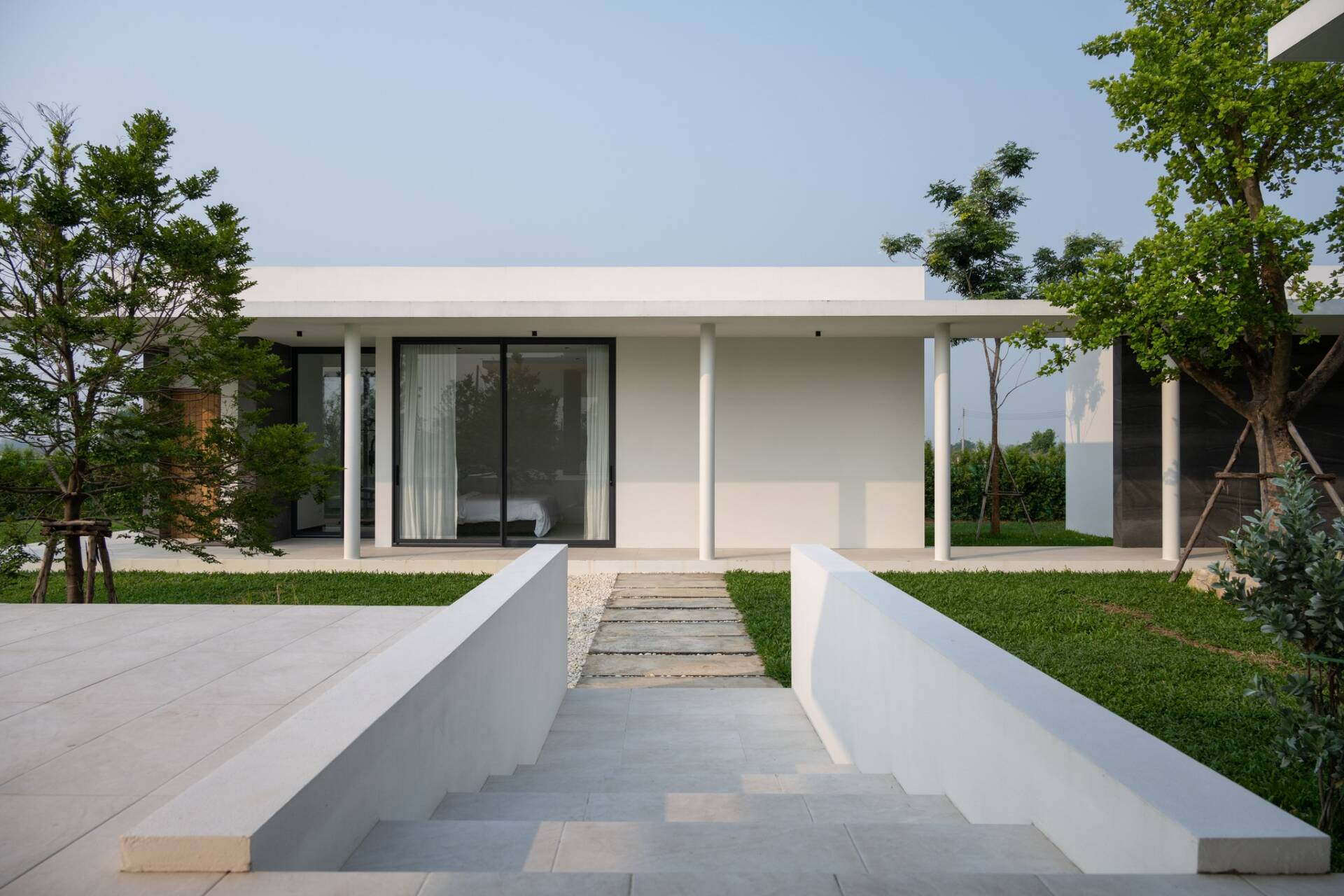 Lối bậc dẫn từ sân chính đến khối phòng ngủ tạo cảm giác trang trọng và cân đối. Cấu trúc mái phẳng và hàng cột trắng thanh mảnh gợi nên vẻ tinh giản, hiện đại đặc trưng của ngôi biệt thự