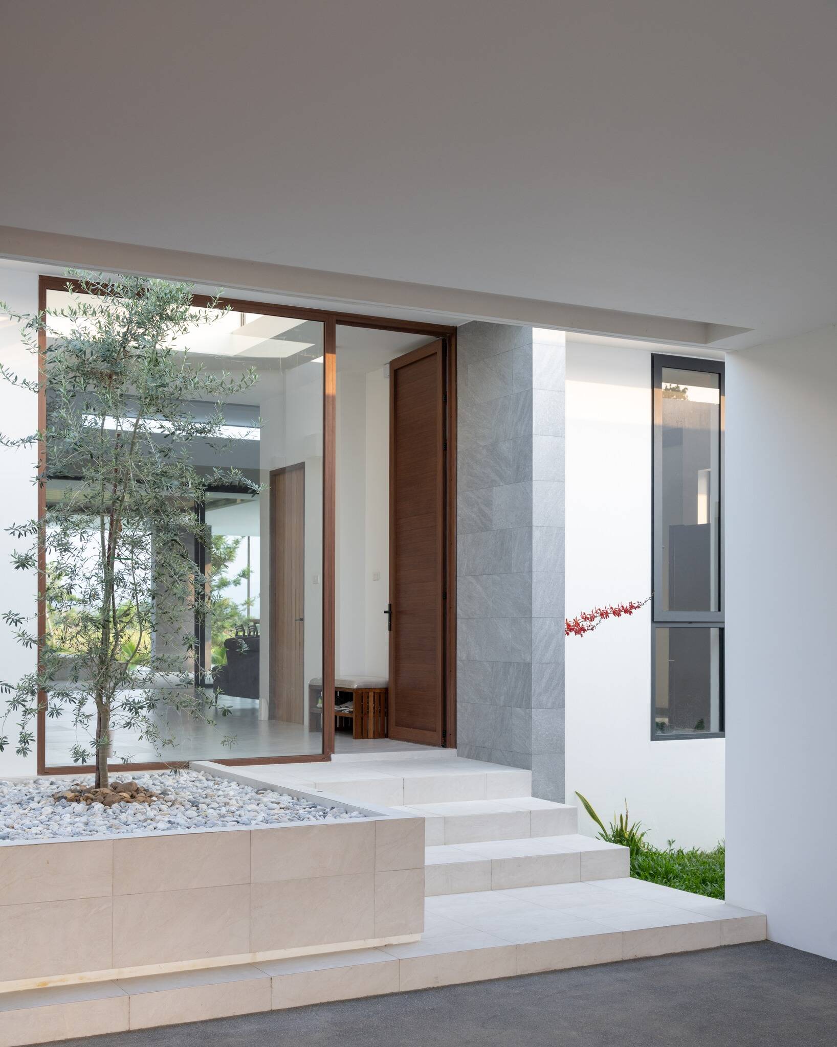 Khu sảnh vào với bồn cây lát sỏi trắng và cửa gỗ cao mang lại cảm giác chào đón nhẹ nhàng. Hệ cửa kính lớn mở ra tầm nhìn xuyên suốt, tạo sự kết nối liền mạch giữa nội thất và cảnh quan