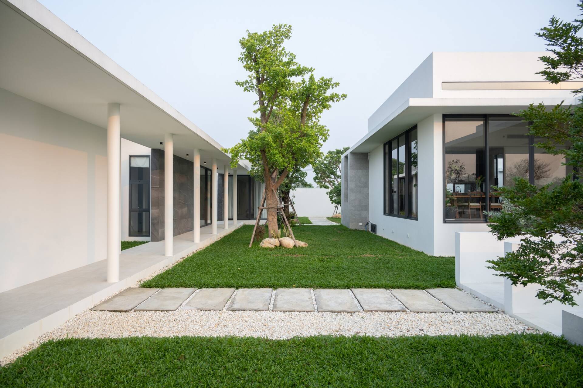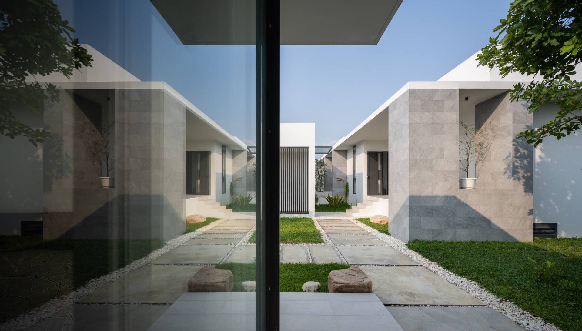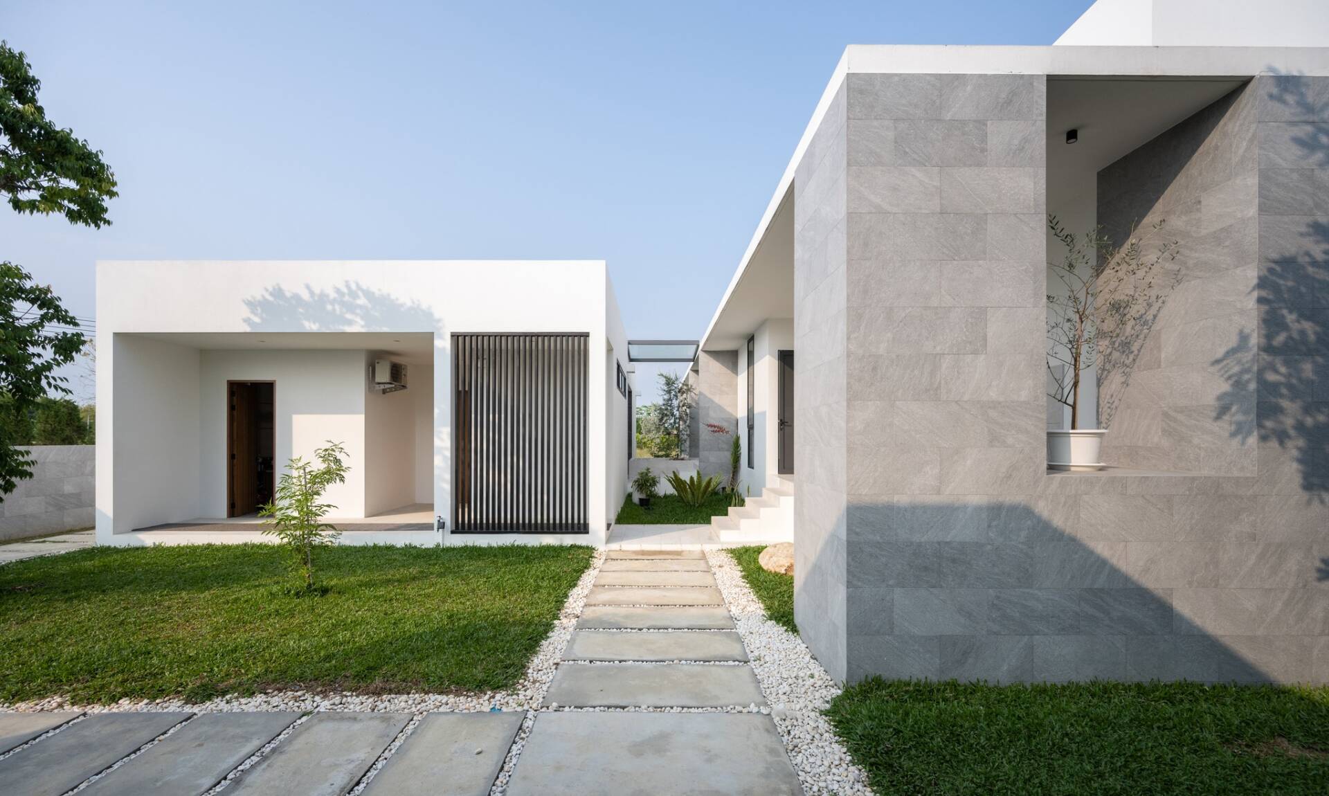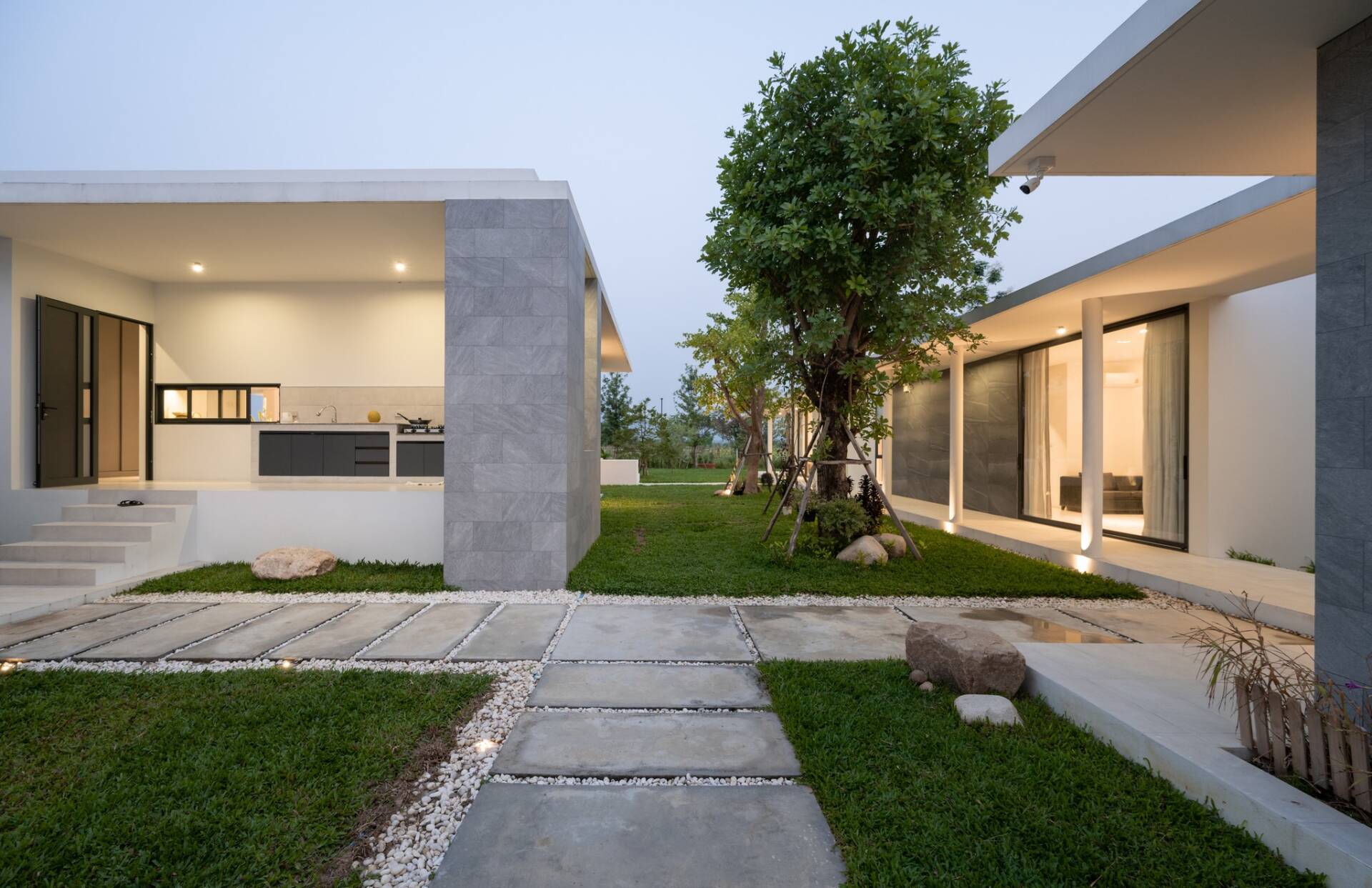 Khoảng sân xanh mát nằm giữa hai khối nhà, kết nối bằng lối đi lát đá xen cỏ. Bố cục tách khối giúp lưu thông gió, tạo sự riêng tư mà vẫn duy trì tính liên kết của tổng thể