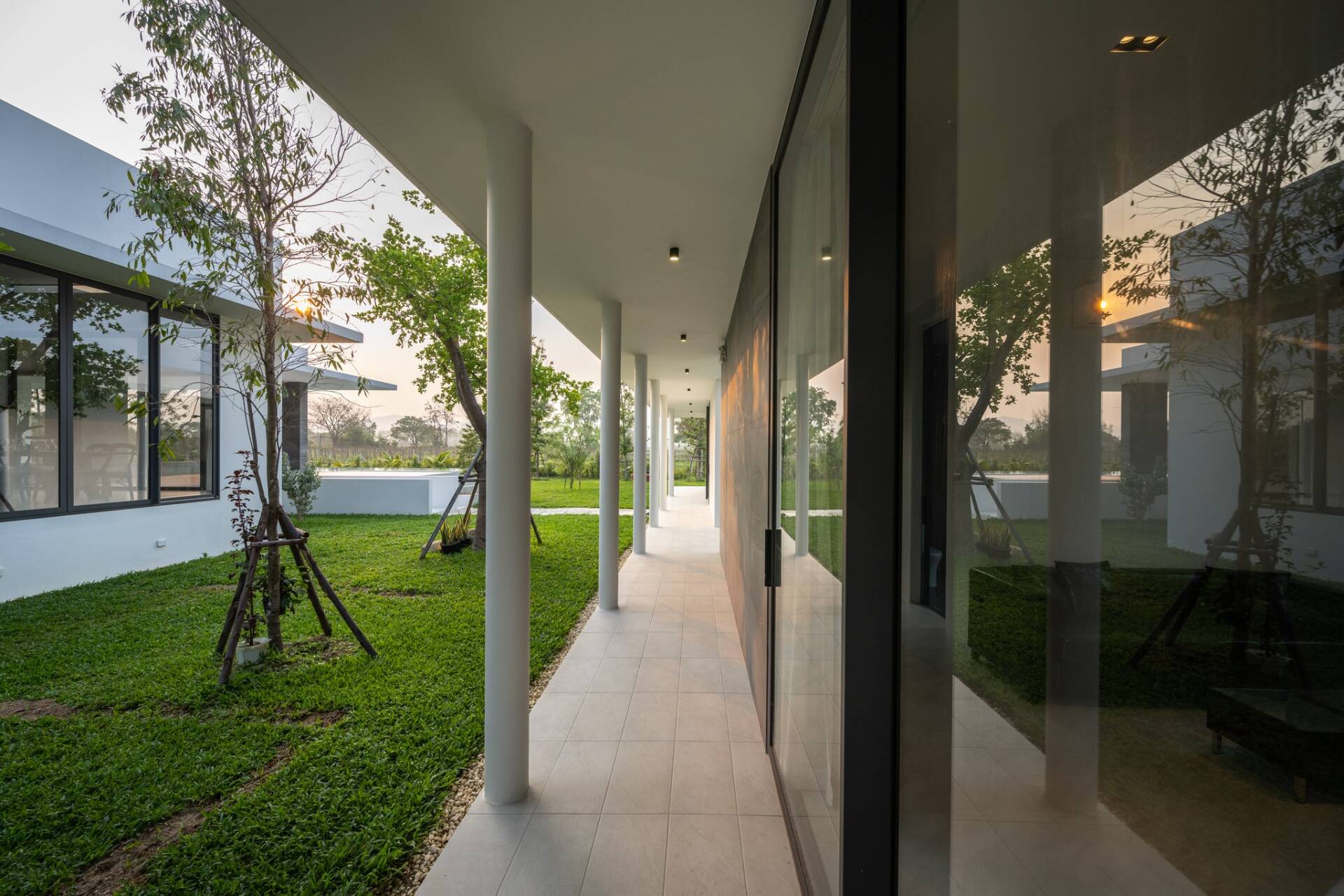 Hành lang có mái che chạy dọc khối nhà, được bao quanh bởi vườn cây và ánh nắng hoàng hôn. Sự kết hợp giữa kính trong suốt và cột trắng mảnh tạo nên khung cảnh yên tĩnh, đậm chất nghỉ dưỡng