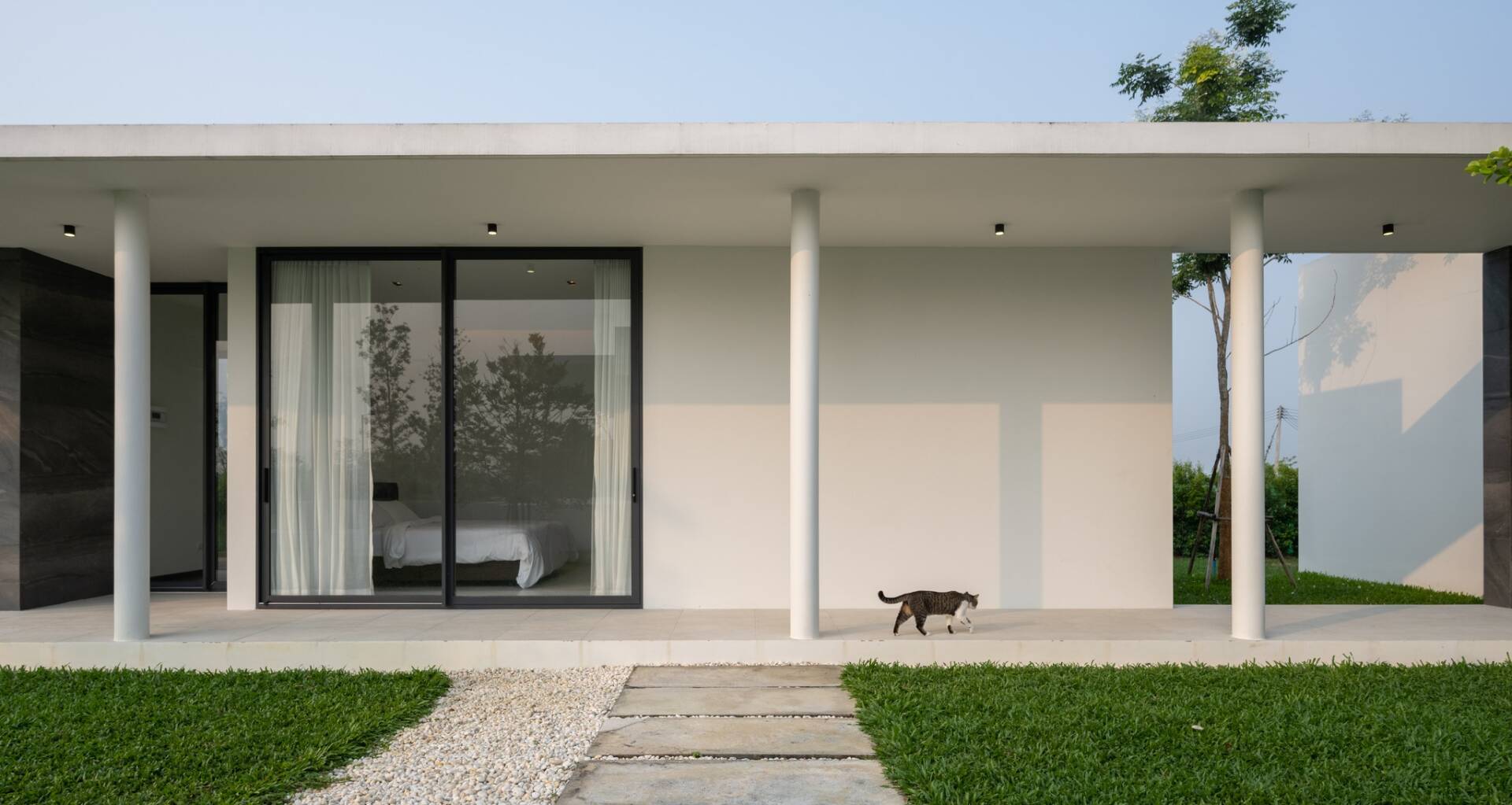 Khối phòng ngủ riêng tư được bao quanh bởi hành lang và cột tròn thanh thoát, nhìn ra khu vườn nhỏ. Sự xuất hiện của chú mèo nhỏ khiến khung cảnh thêm sống động, thể hiện đúng tinh thần gần gũi và bình yên của ngôi nhà