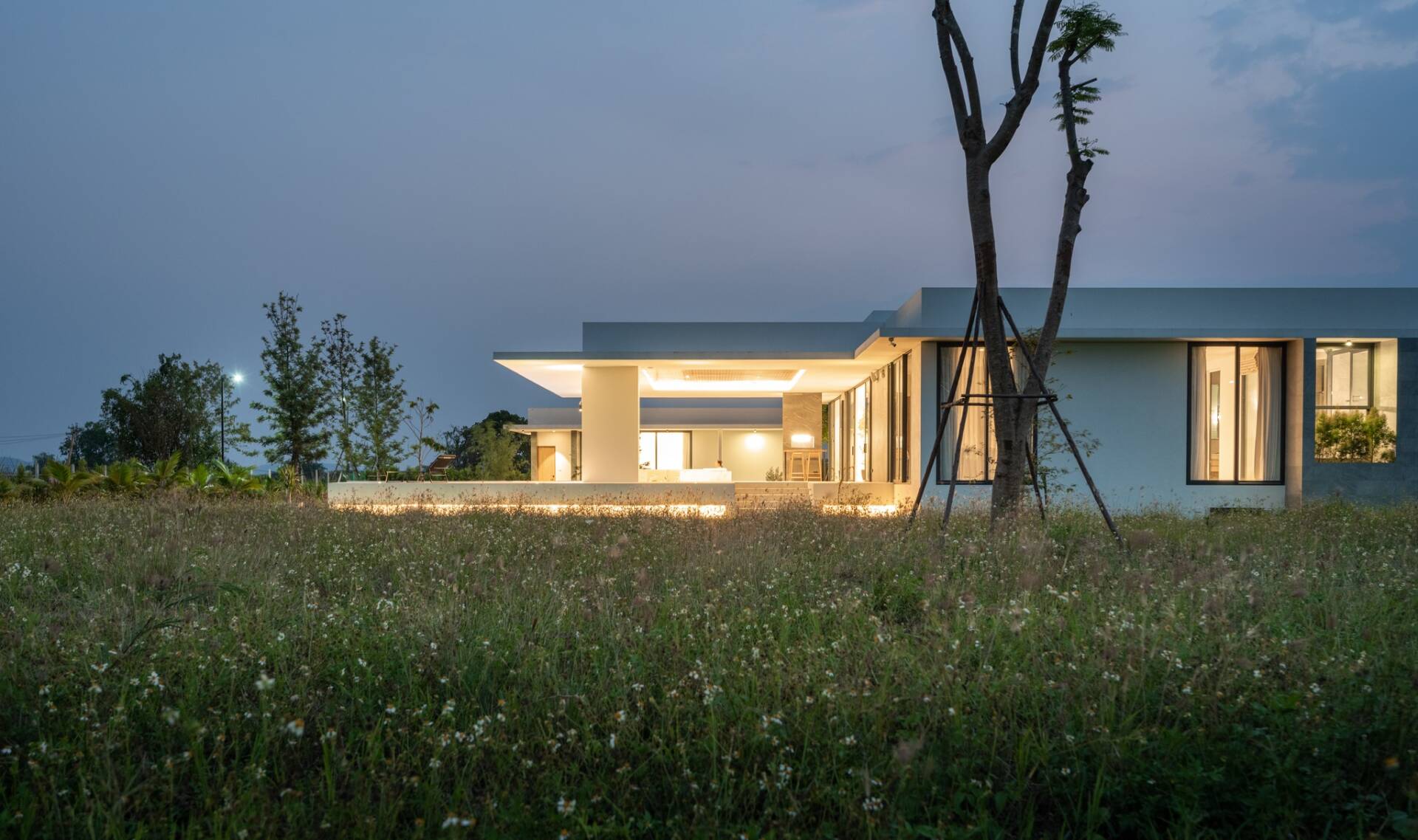 Toàn cảnh biệt thự khi màn đêm buông xuống, ánh sáng vàng hắt nhẹ qua lớp kính tạo cảm giác ấm áp. Khối nhà trải dài theo phương ngang, hòa mình trong đồng cỏ, đúng với tinh thần “sống cùng đường chân trời”