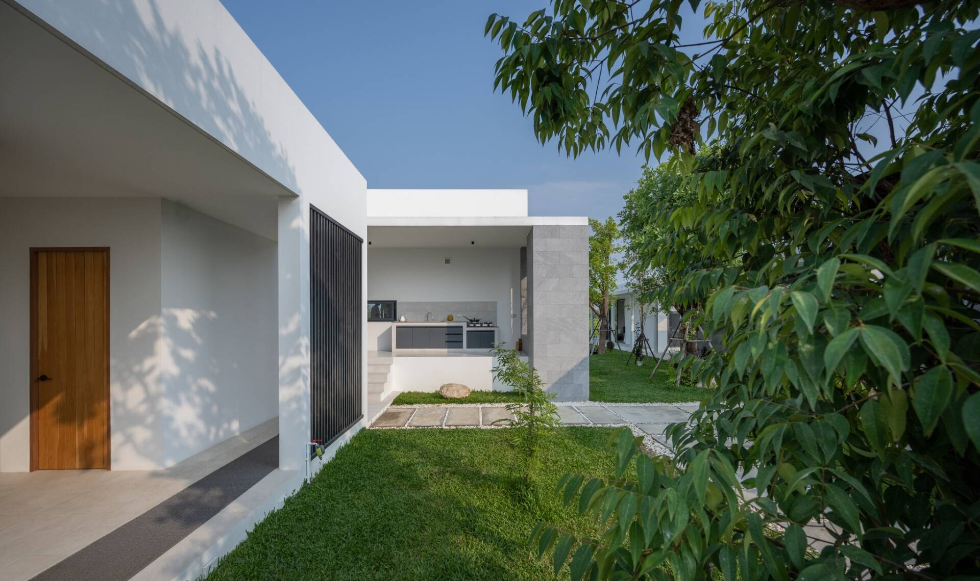 Từ góc nhìn sau hàng cây, khu bếp phụ mở ra khoảng sân xanh mát, liền kề khối sinh hoạt chính. Cách bố trí tách khối giúp mọi không gian đều tiếp xúc với ánh sáng và thiên nhiên bên ngoài