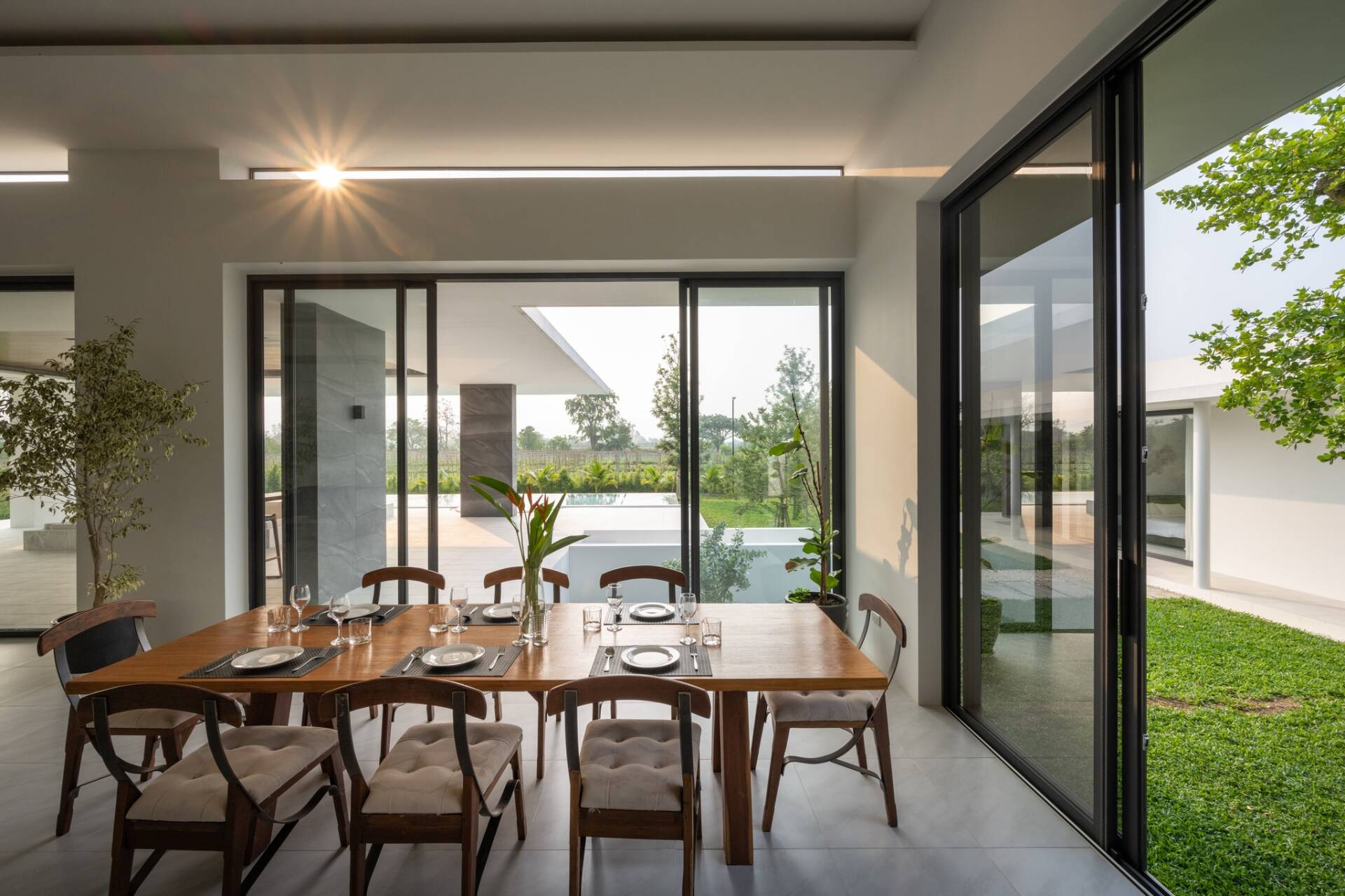 Phòng ăn với bàn gỗ dài và ánh sáng chiếu qua hệ cửa kính trong suốt, nhìn ra hồ bơi và vườn xanh. Việc sử dụng cửa trượt toàn chiều cao giúp không gian bên trong luôn sáng và thông thoáng