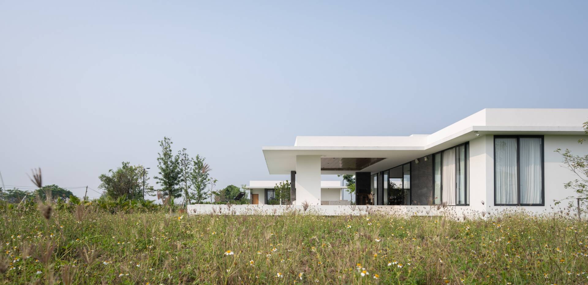 Góc nhìn từ cánh đồng vào khu nhà chính cho thấy khối kiến trúc phẳng trải dài giữa thiên nhiên. Tỷ lệ mái và tường được tính toán cân đối để công trình hòa lẫn nhẹ nhàng trong bối cảnh xung quanh
